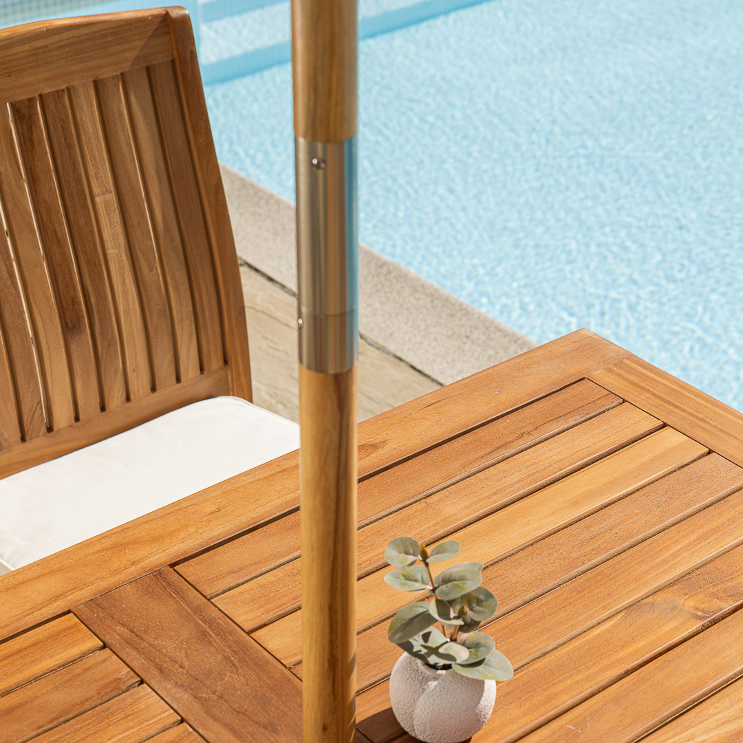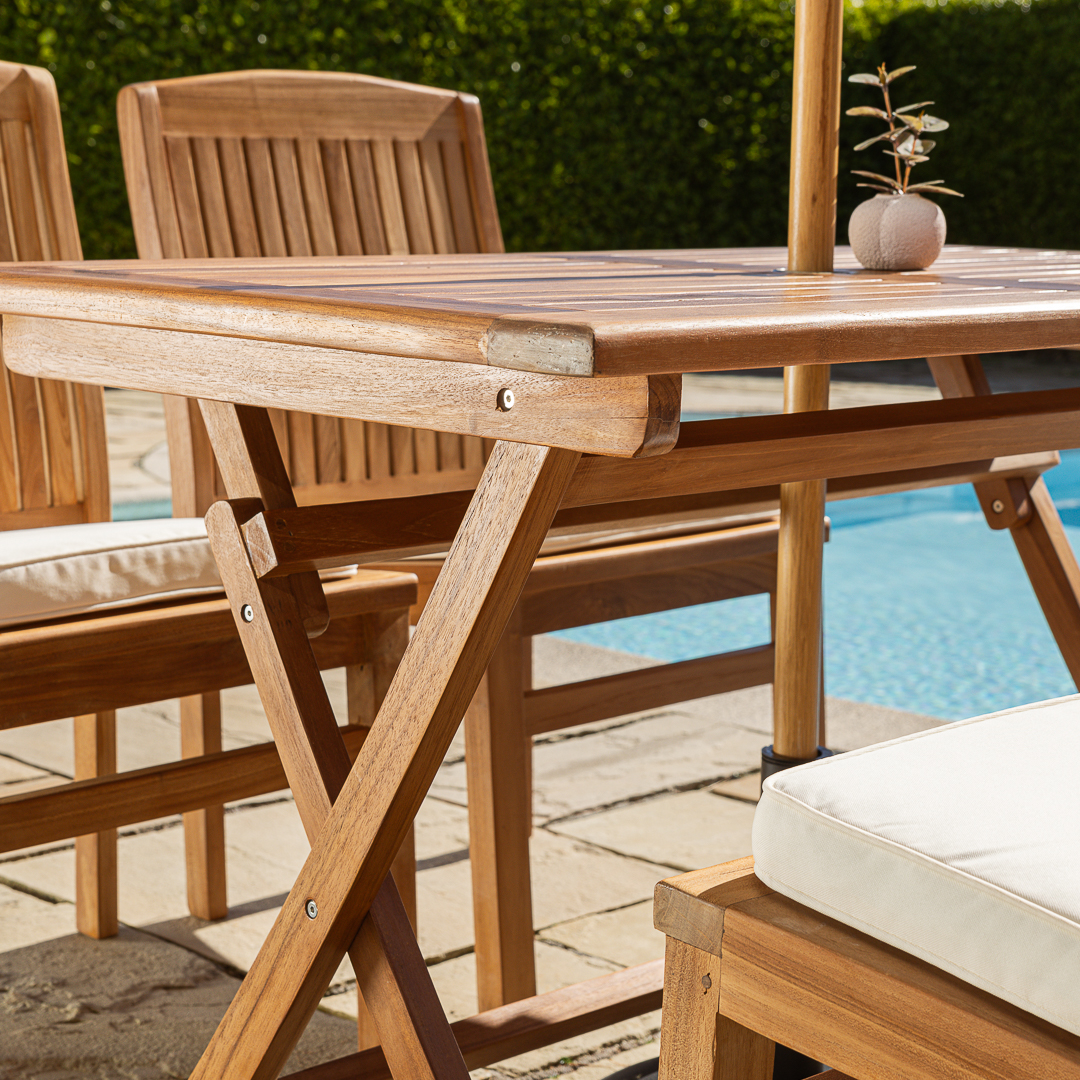 150cm Rectangular Certified Teak Outdoor Dining Table with 6 Cora Teak Folding ChairsIn stock