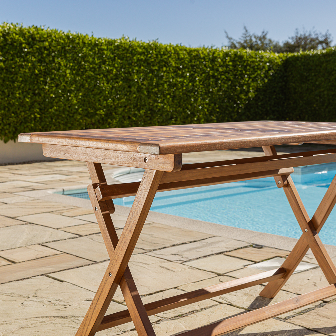 150cm Rectangular Certified Teak Outdoor Dining Table with 6 Cora Teak Folding ChairsIn stock