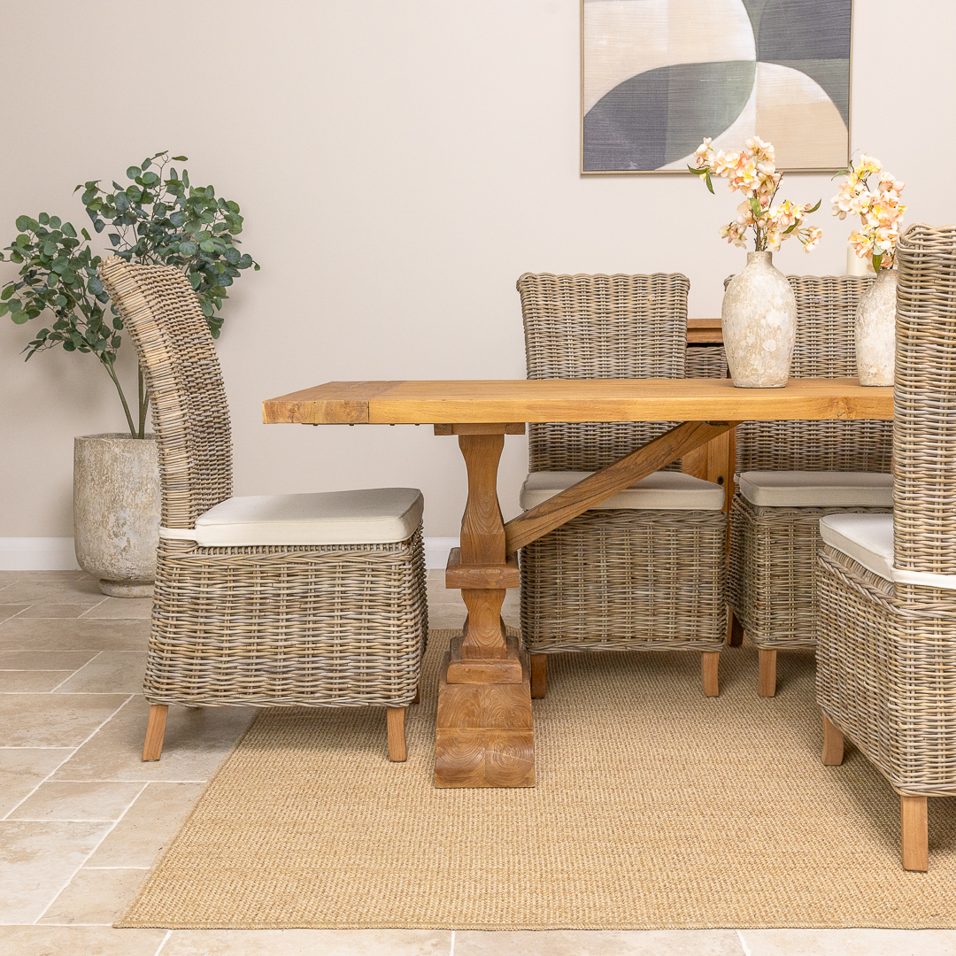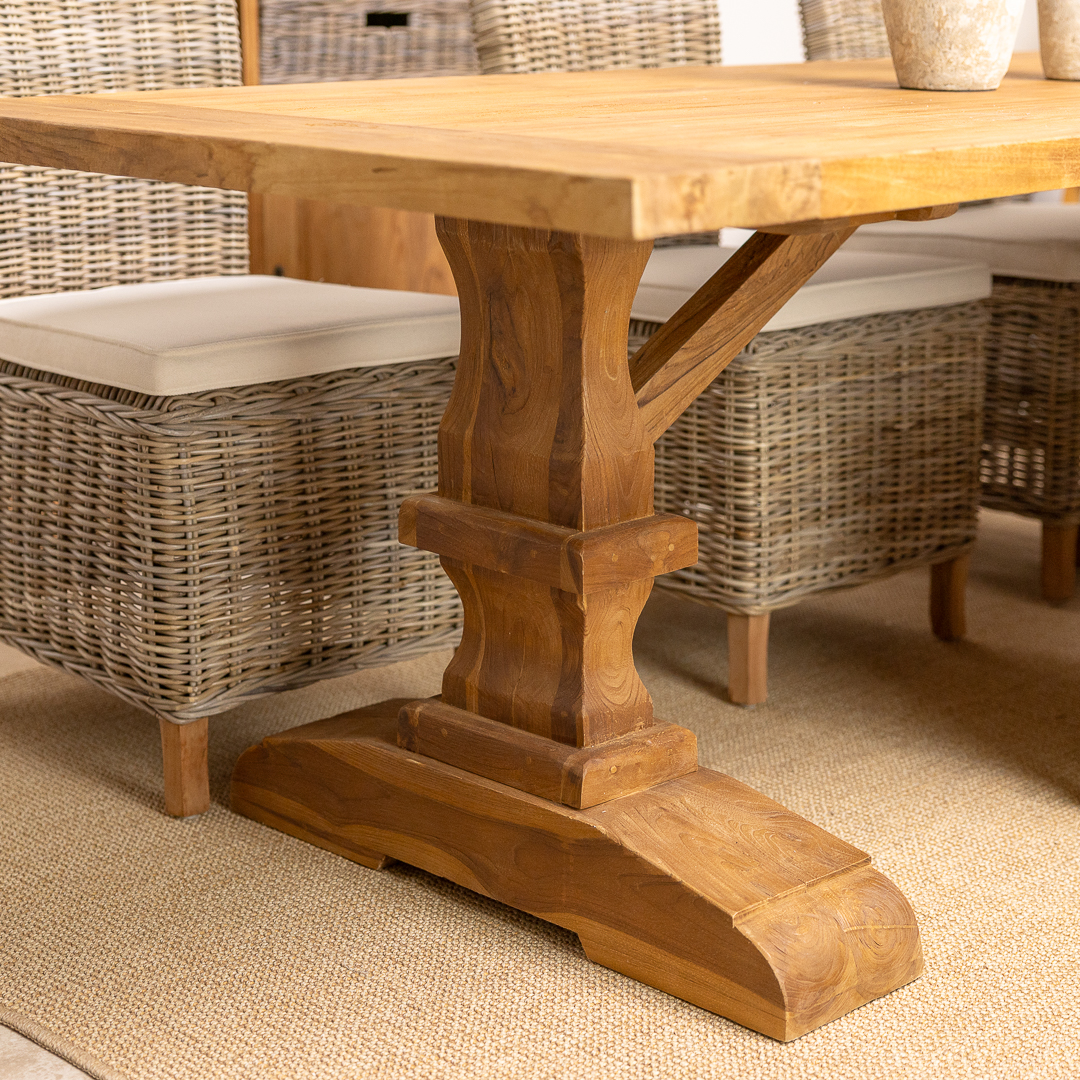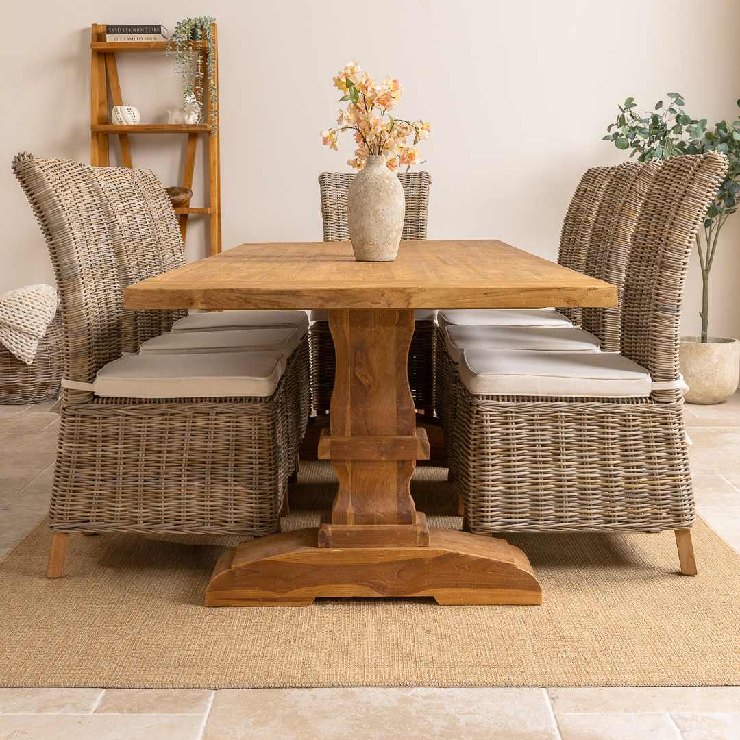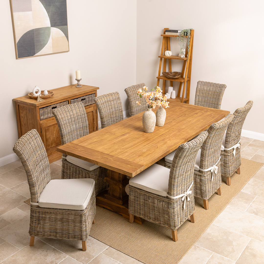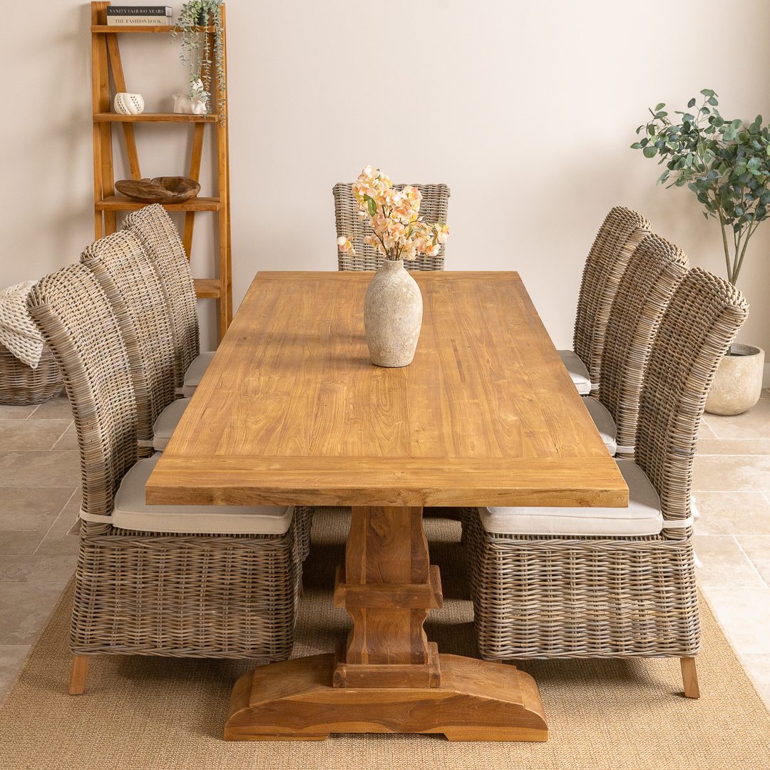 This carved pedestal Monastery dining set pairs a 240cm rectangular reclaimed teak table with six or eight natural Kubu wicker chairs. The combination of rustic timber and woven texture creates a warm, inviting dining atmosphere ideal for family gatherings, entertaining, or open‑plan living spaces.
