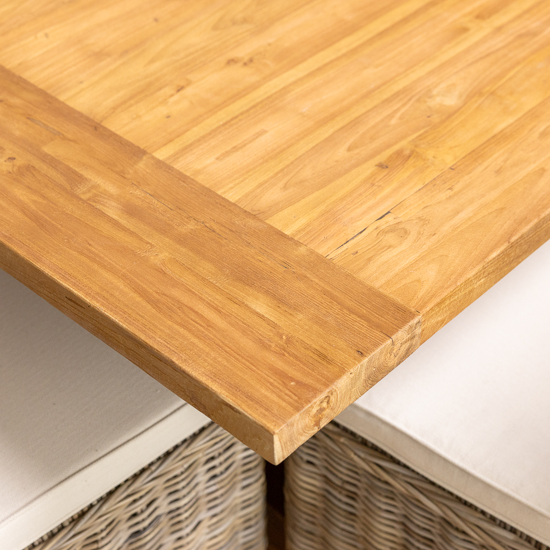 240cm Rectangular Rustic Reclaimed Teak Indoor Dining Table with 6 or 8 Natural Kubu Wicker Chairs