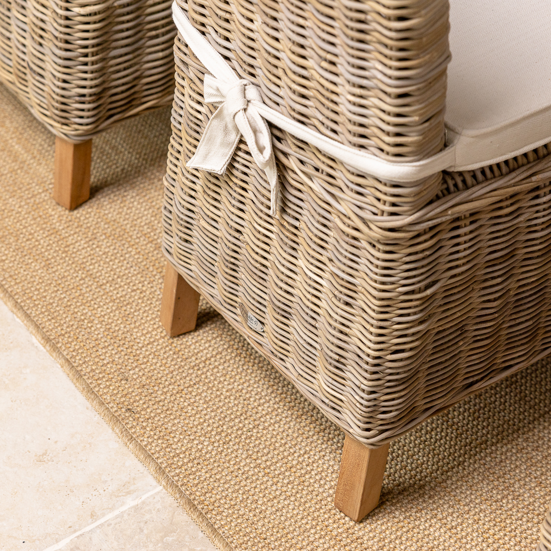 Natural Kubu Wicker Indoor/Outdoor Scroll Dining Armchair with Natural Linen CushionIn stock