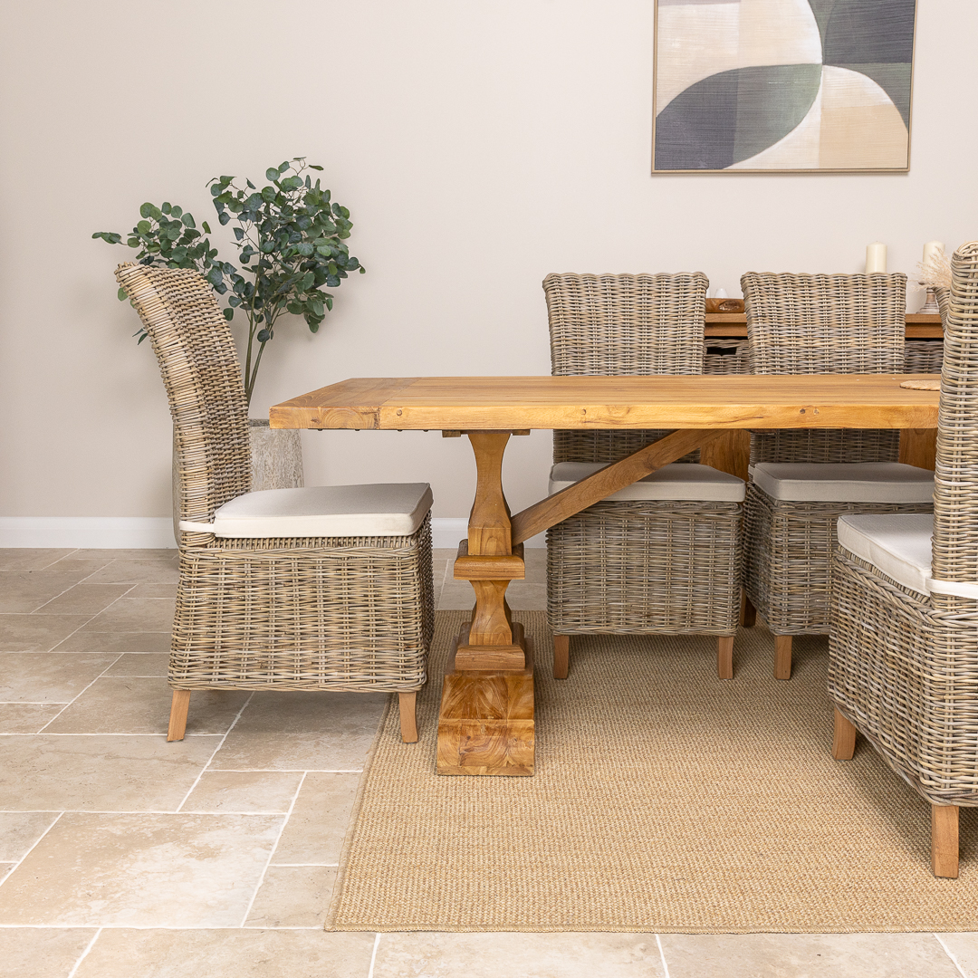 240cm Rectangular Rustic Reclaimed Teak Indoor Dining Table with 6 or 8 Natural Kubu Wicker ChairsIn stock