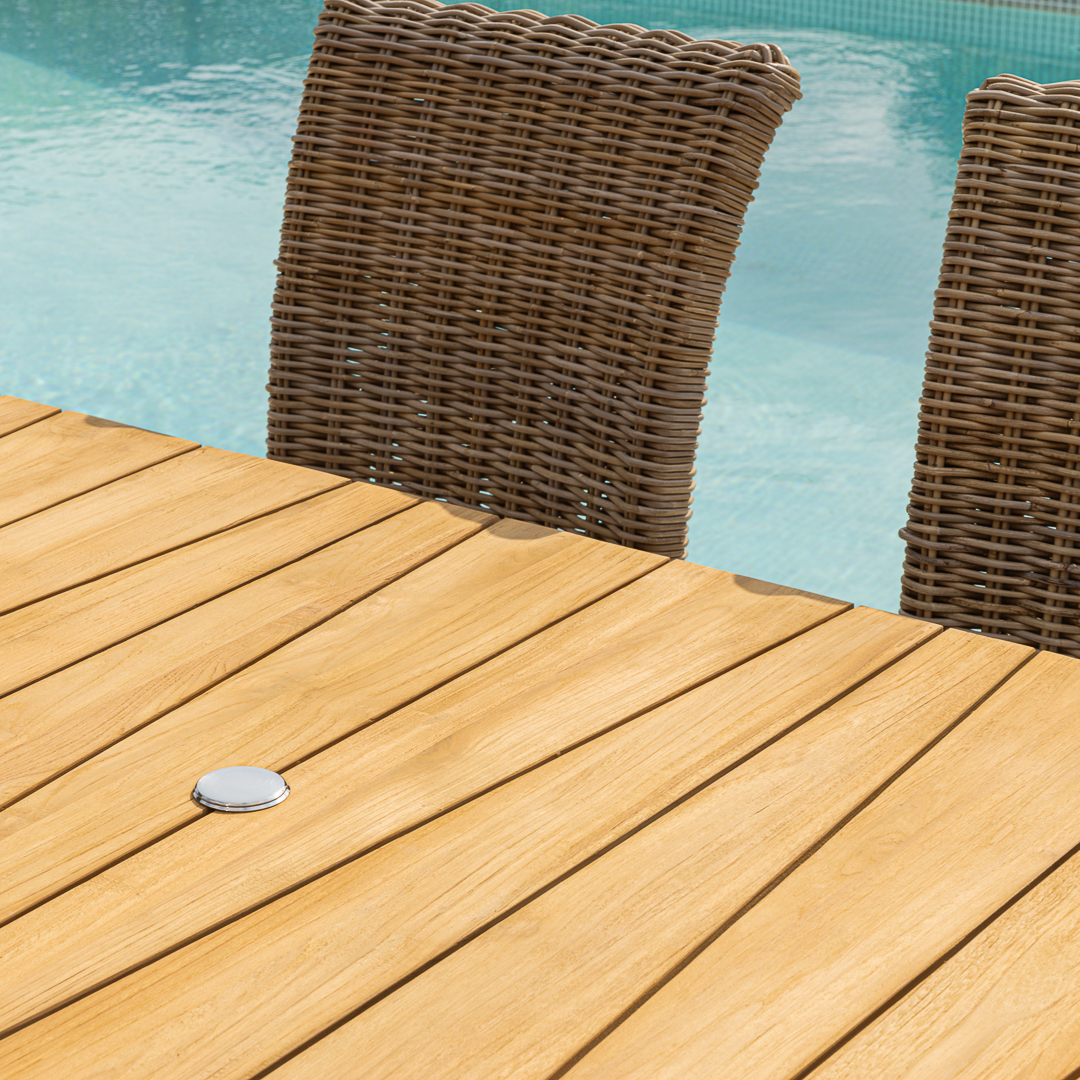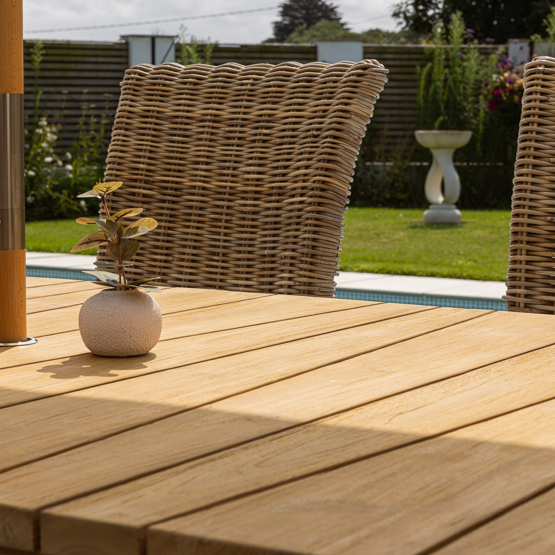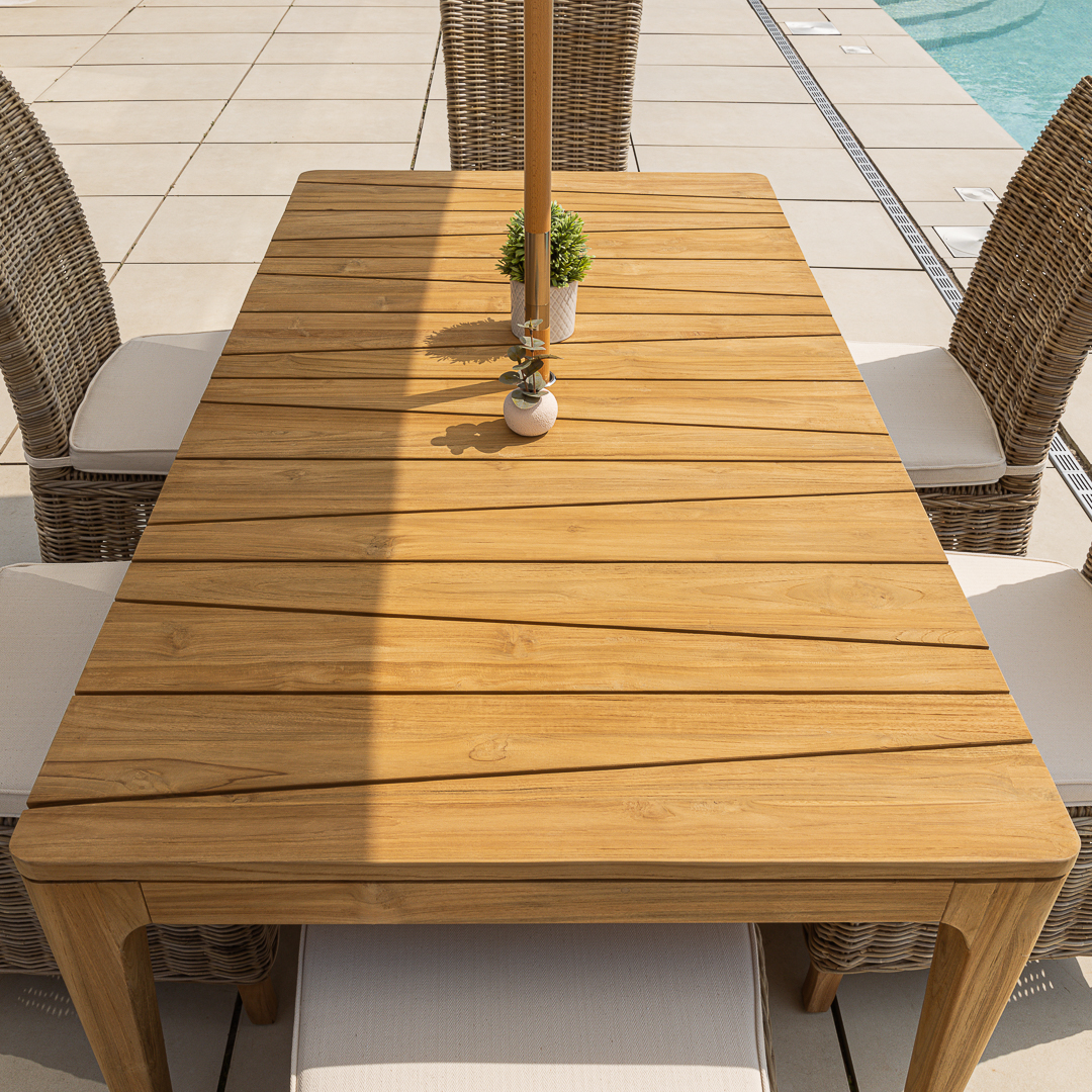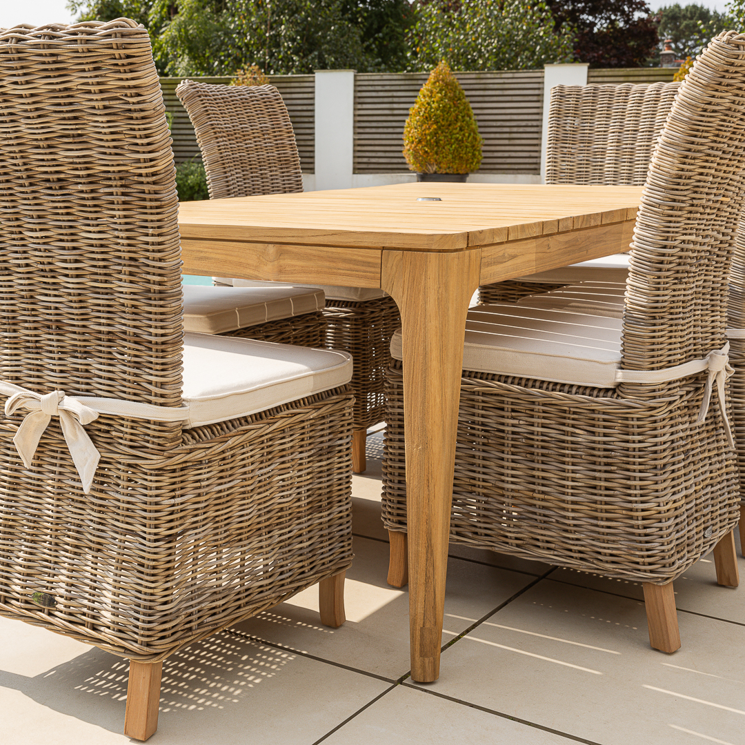180cm Rectangular Honey Brown Reclaimed Teak Angled Slat Outdoor Dining Table with 4 or 6 Natural Kubu Wicker Chairs
