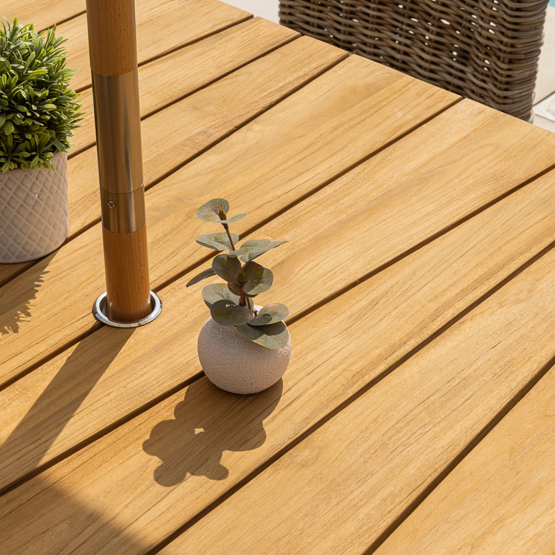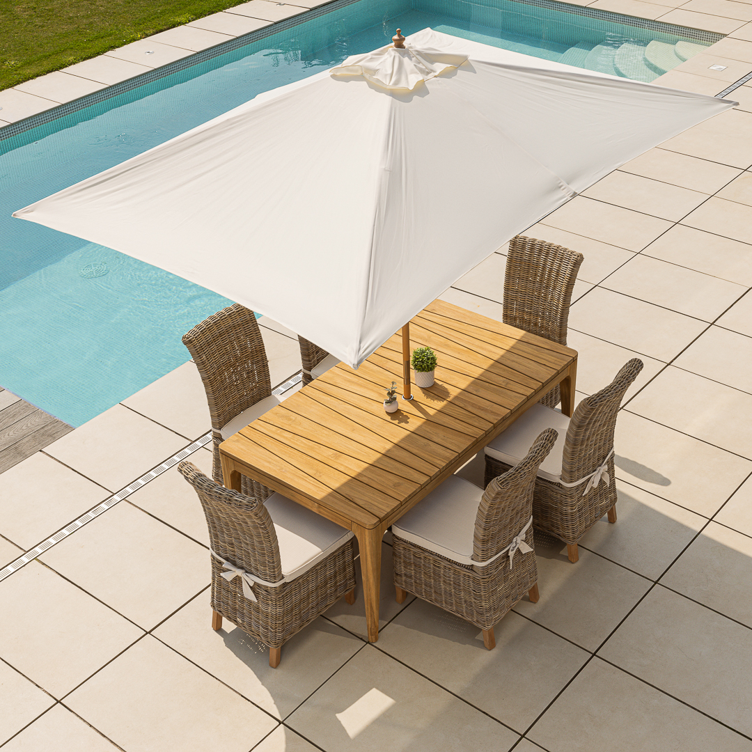 This Oasis Dining Set pairs a 180cm honey‑brown reclaimed teak table with Natural Kubu wicker chairs for a warm, textural outdoor look. The angled‑slat tabletop showcases beautiful grain variation and rich colouring, while the woven chairs add organic comfort. A stylish, inviting setup for relaxed garden dining.
