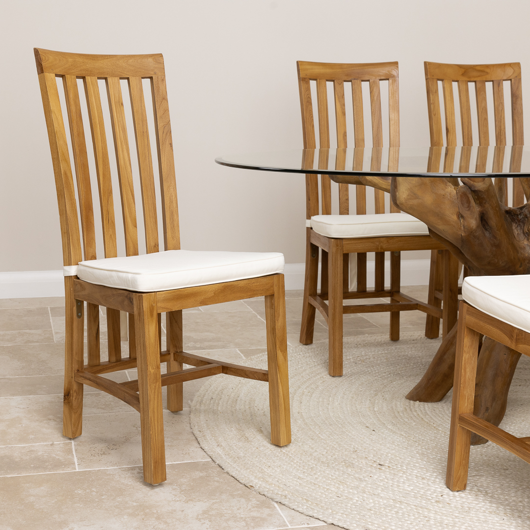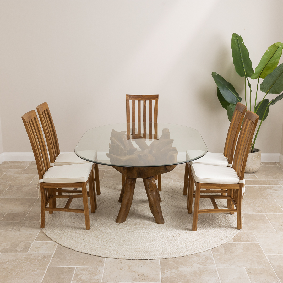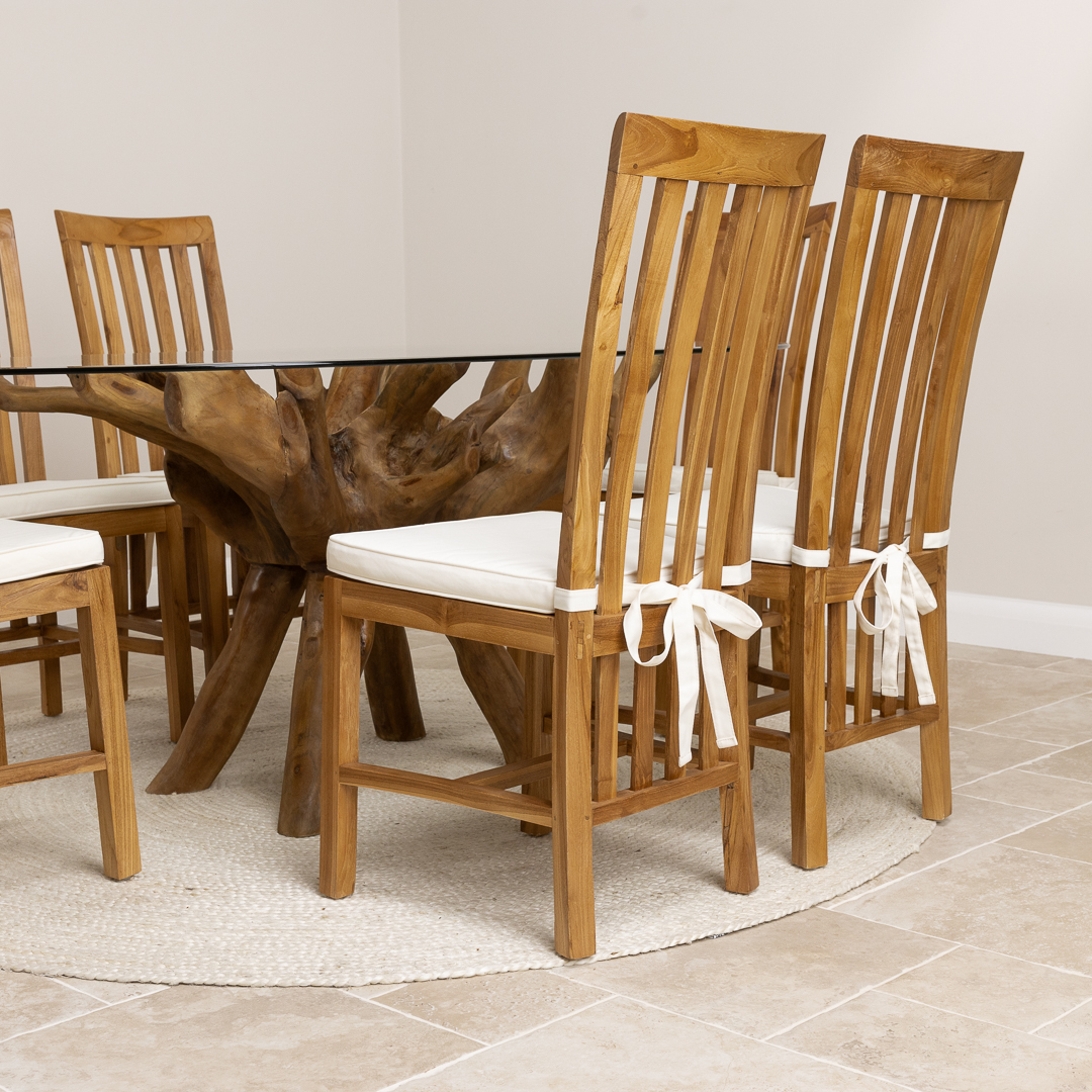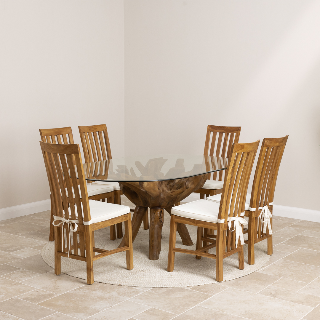 180cm x 120cm Rectangular Teak Root Dining Table with 4 or 6 Upholstered Cove ChairsIn stock