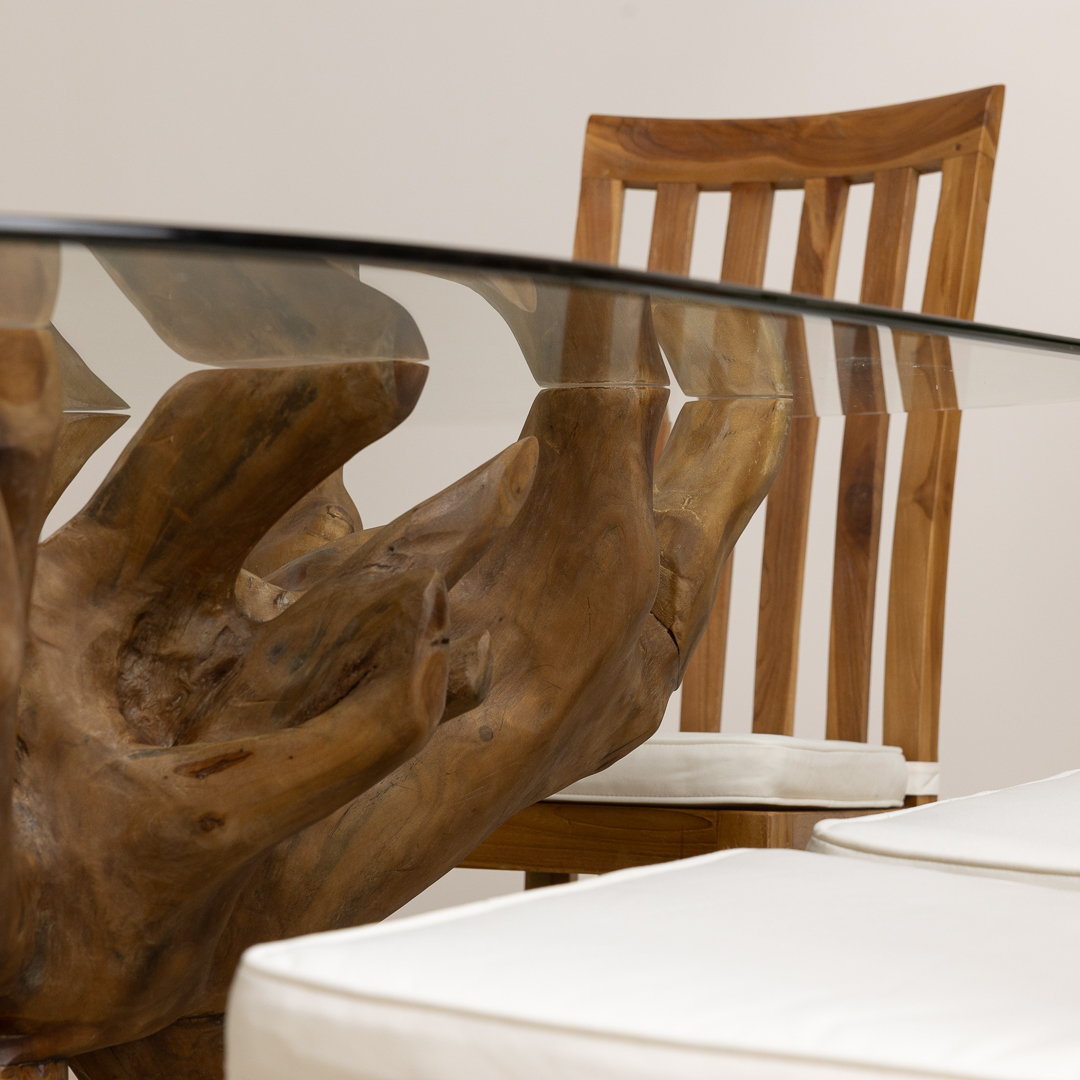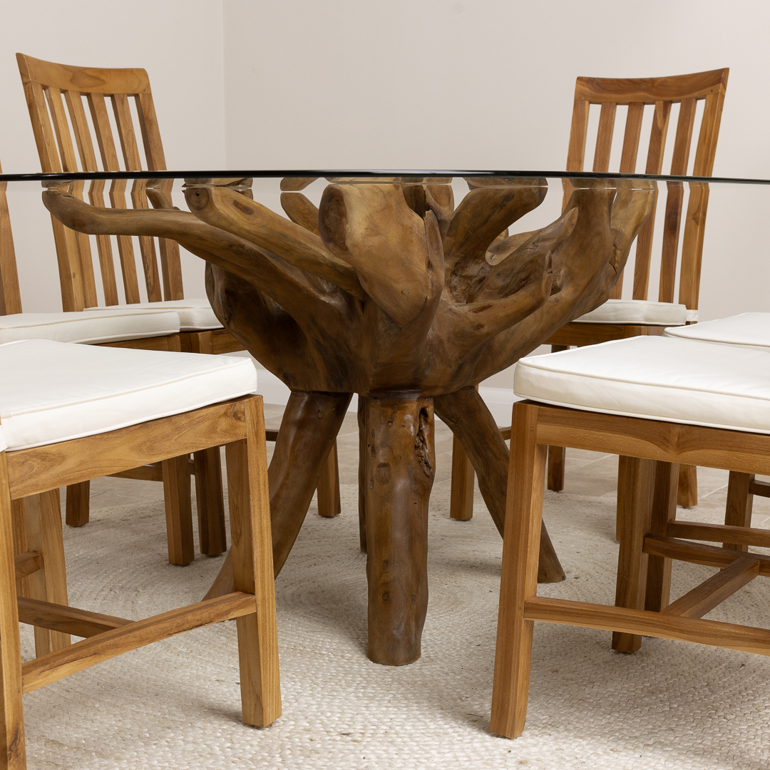 150cm Circular Reclaimed Teak Root Piece Dining Table with 10mm Toughened Safety GlassIn stock