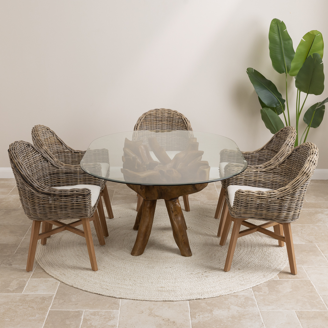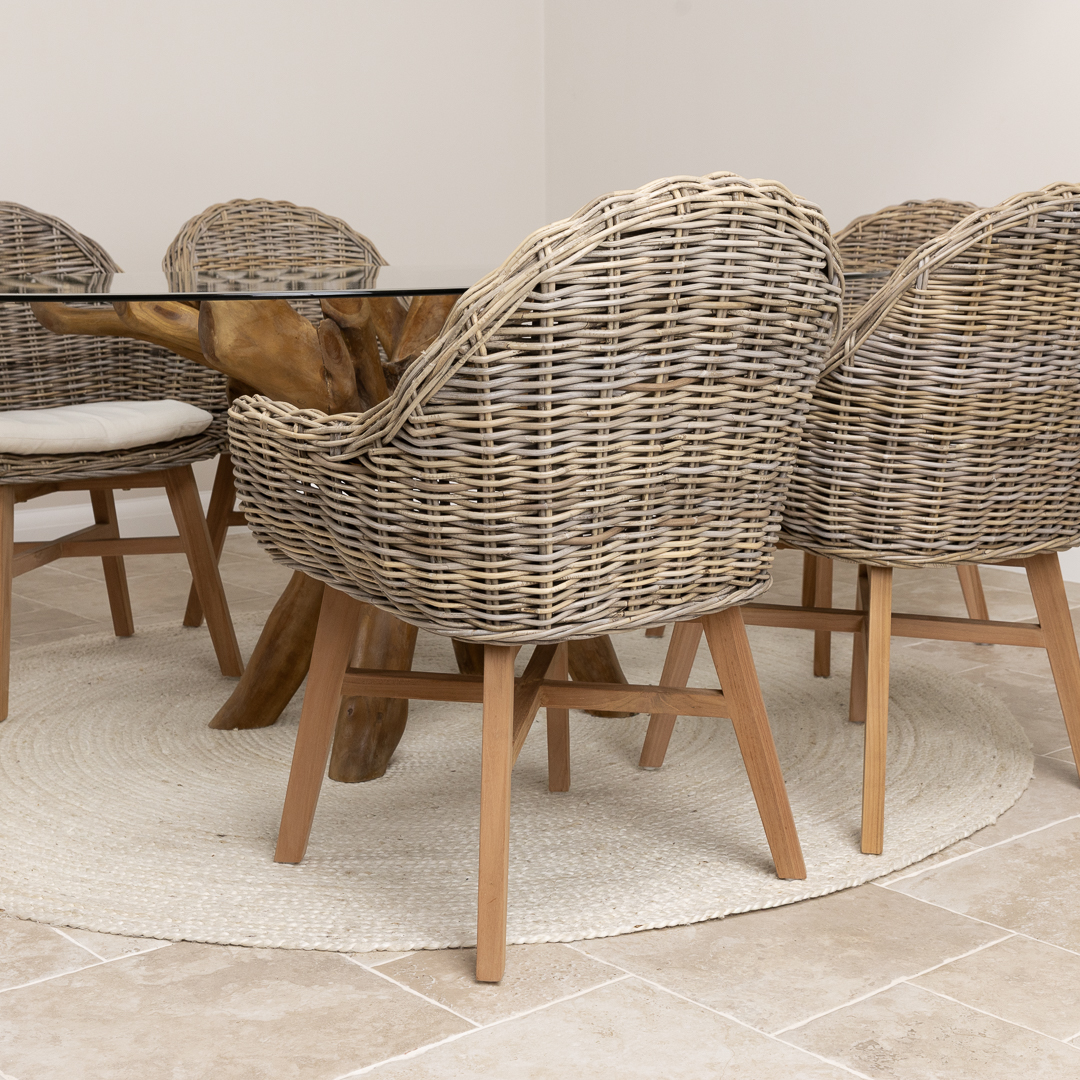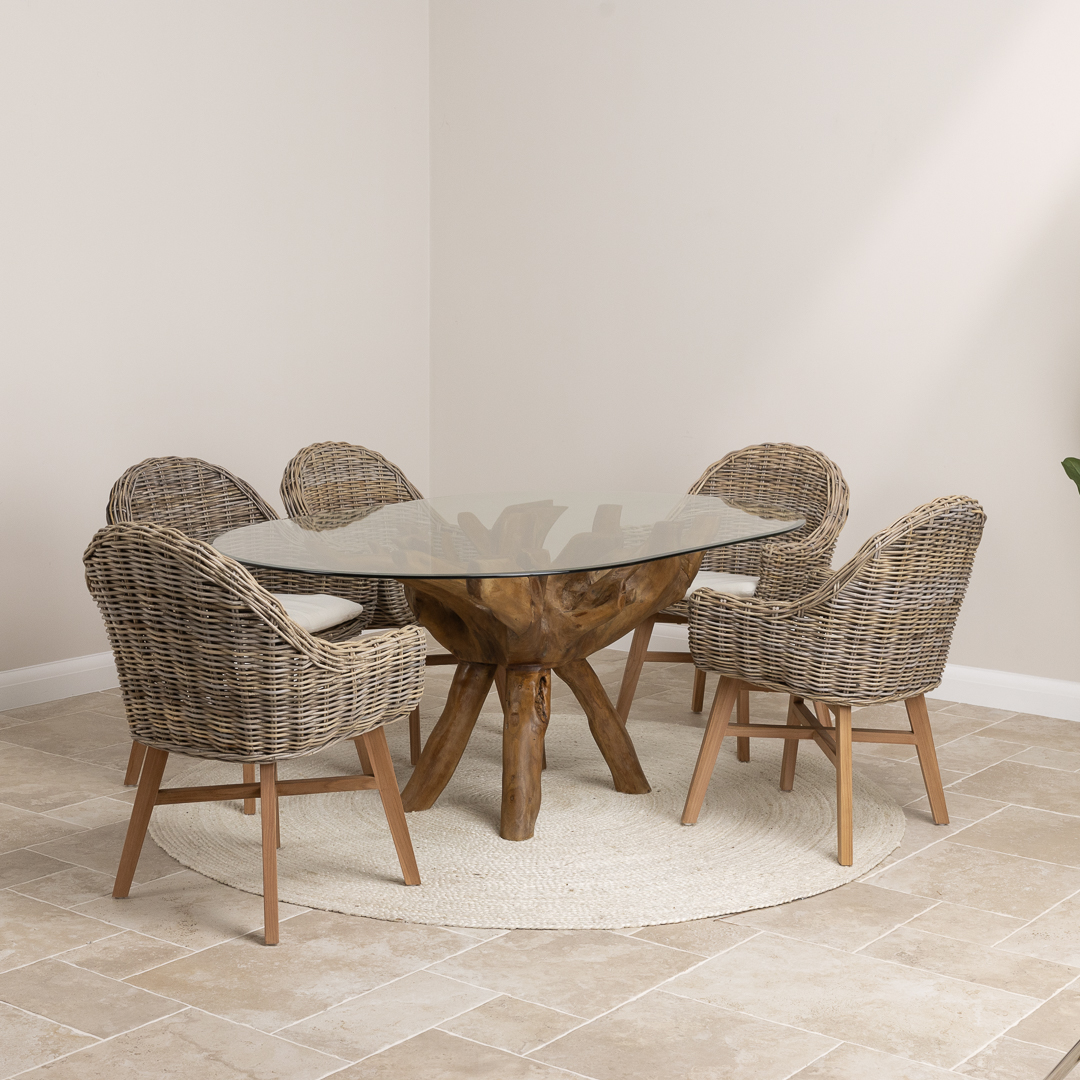 180cm x 120cm Oval Teak Root Dining Table with 6 Natural Kubu Wicker ChairsIn stock