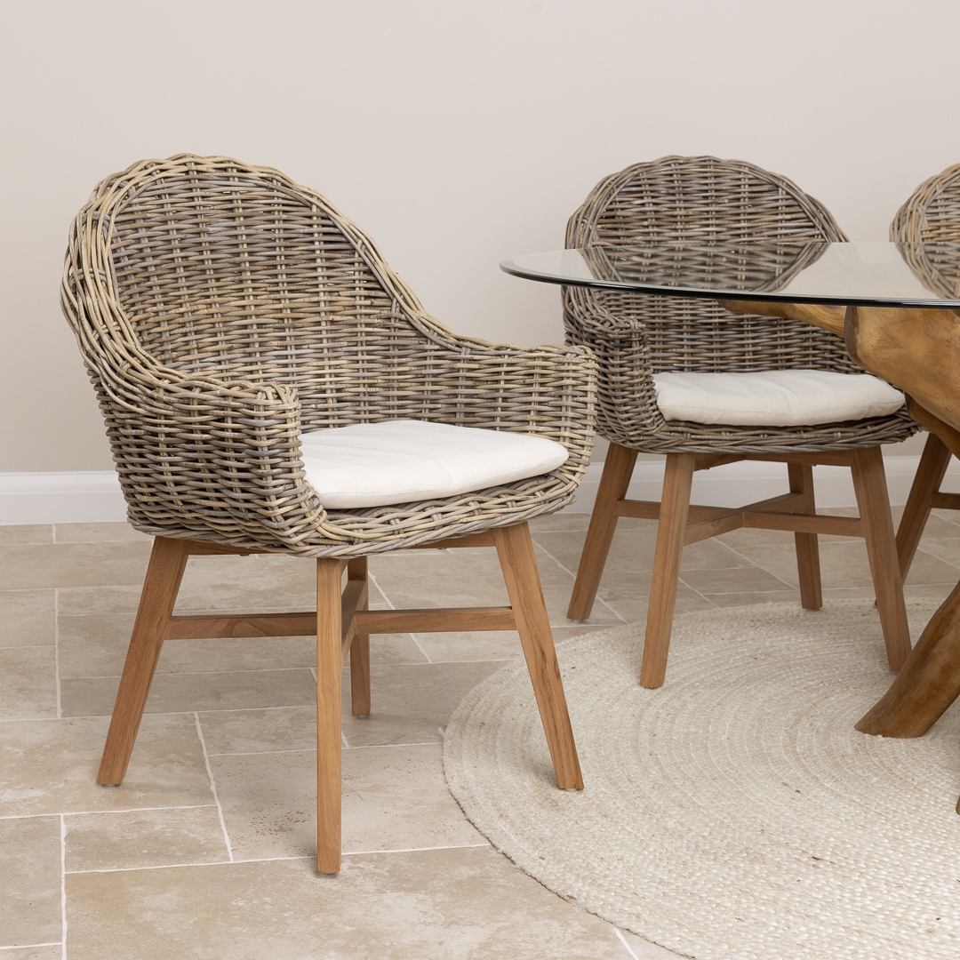 180cm x 120cm Rectangular Reclaimed Teak Root Indoor Dining Table with 4 or 6 Natural Kubu Wicker ChairsIn stock