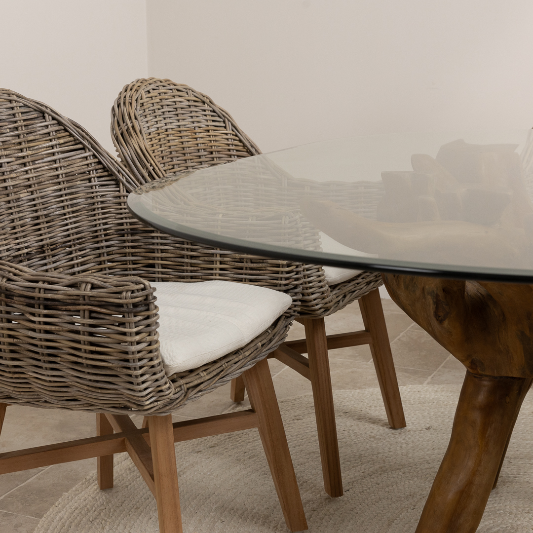 Designed for modern simplicity, the Olira set combines an eye‑catching 180cm oval teak root dining table with six Scandi armchairs. The bold, organic table base contrasts perfectly with the clean lines of the handwoven Kubu wicker chairs, creating a stylish and inviting dining space with understated Nordic influence. The reclaimed teak root base supports a strong 10mm toughened safety glass top.