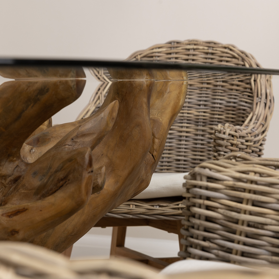 120cm Circular Teak Root Piece Dining Table with 4 Natural Kubu Wicker ChairsIn stock