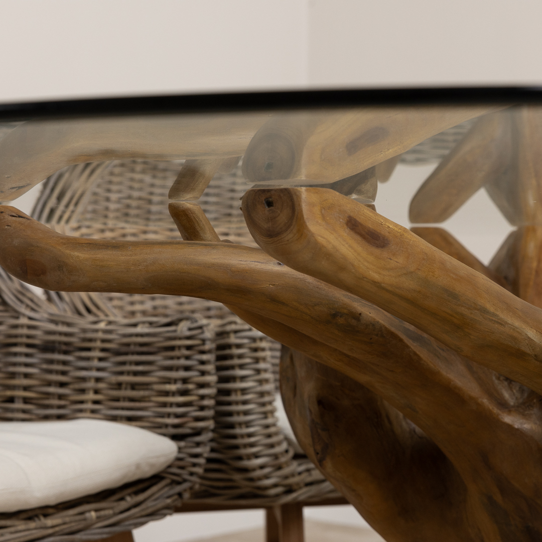 150cm Circular Reclaimed Teak Root Piece Dining Table with 10mm Toughened Safety GlassIn stock