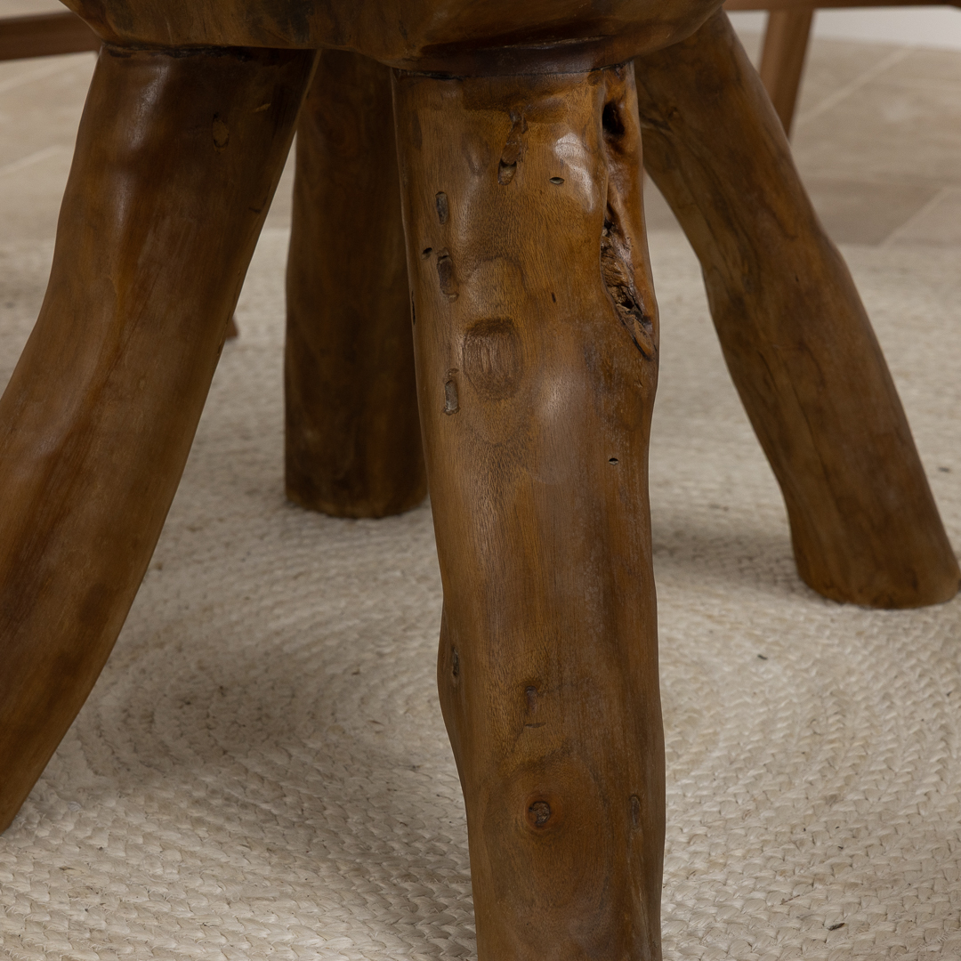 120cm Circular Teak Root Piece Dining Table with 4 Upholstered Cove ChairsIn stock
