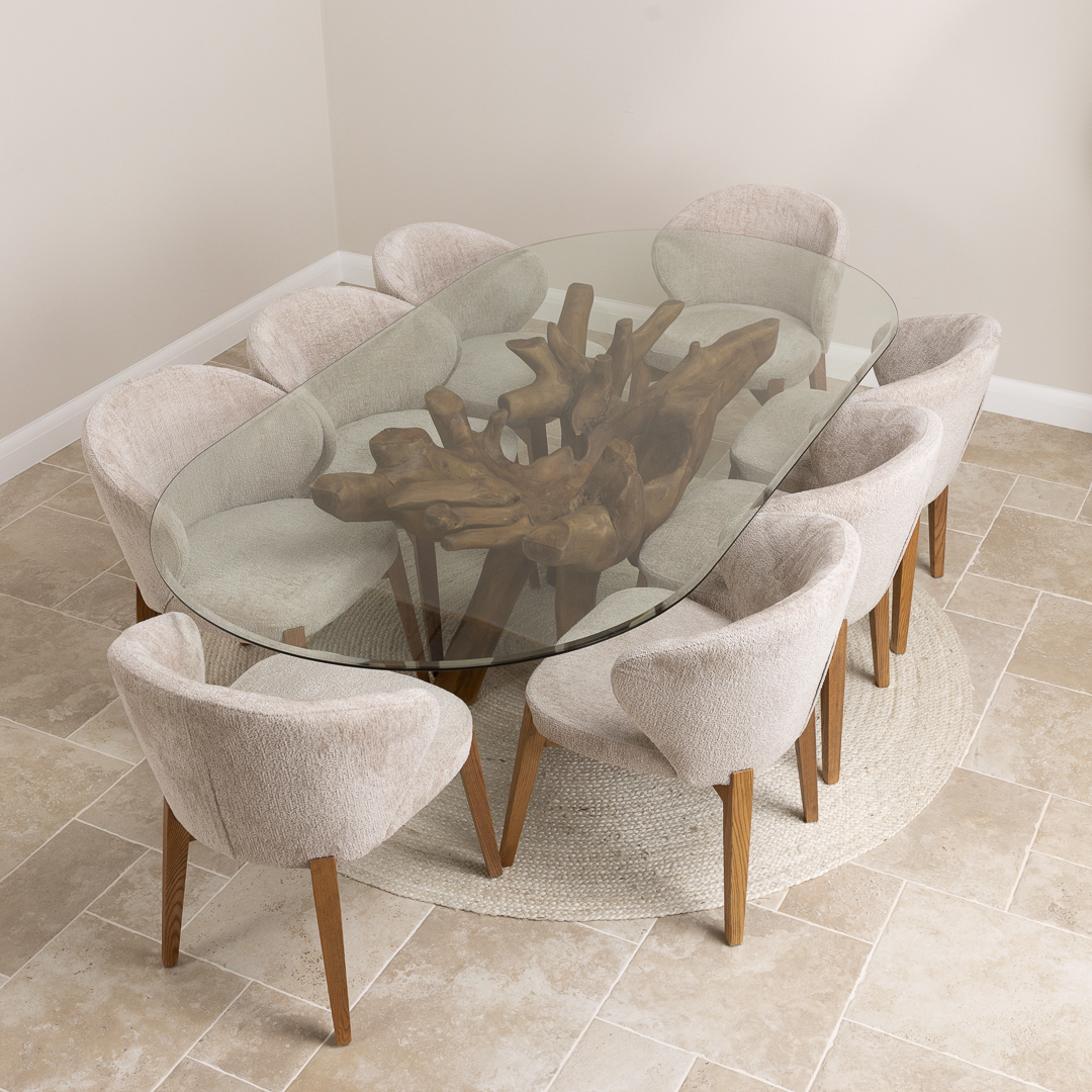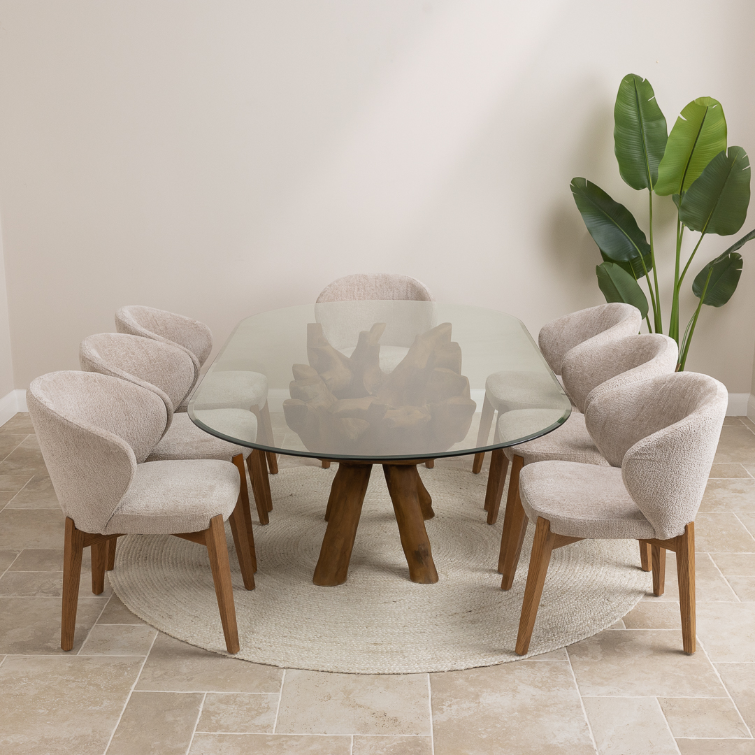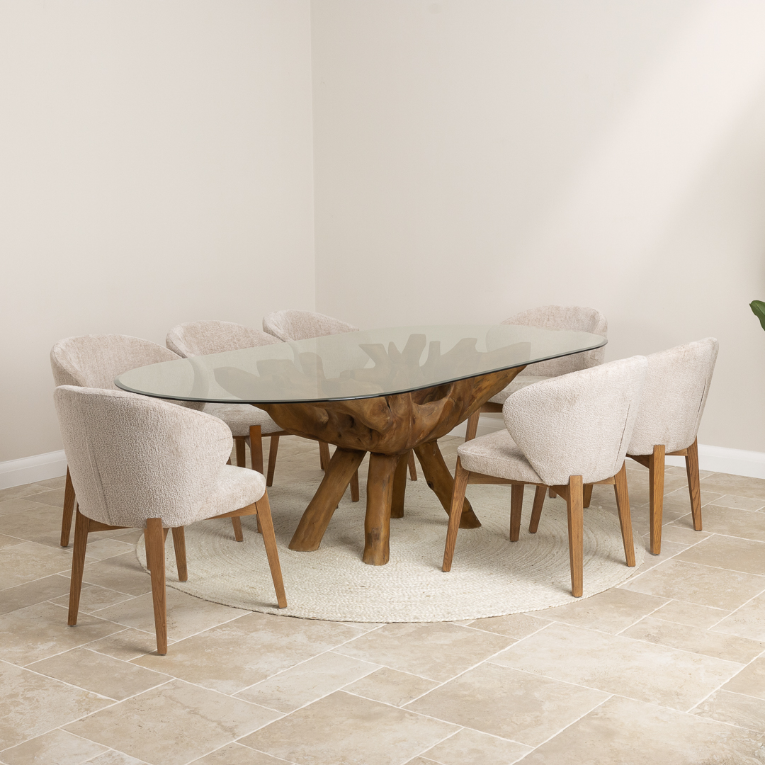 180cm x 120cm Oval Teak Root Dining Table with 6 Upholstered Cove ChairsIn stock
