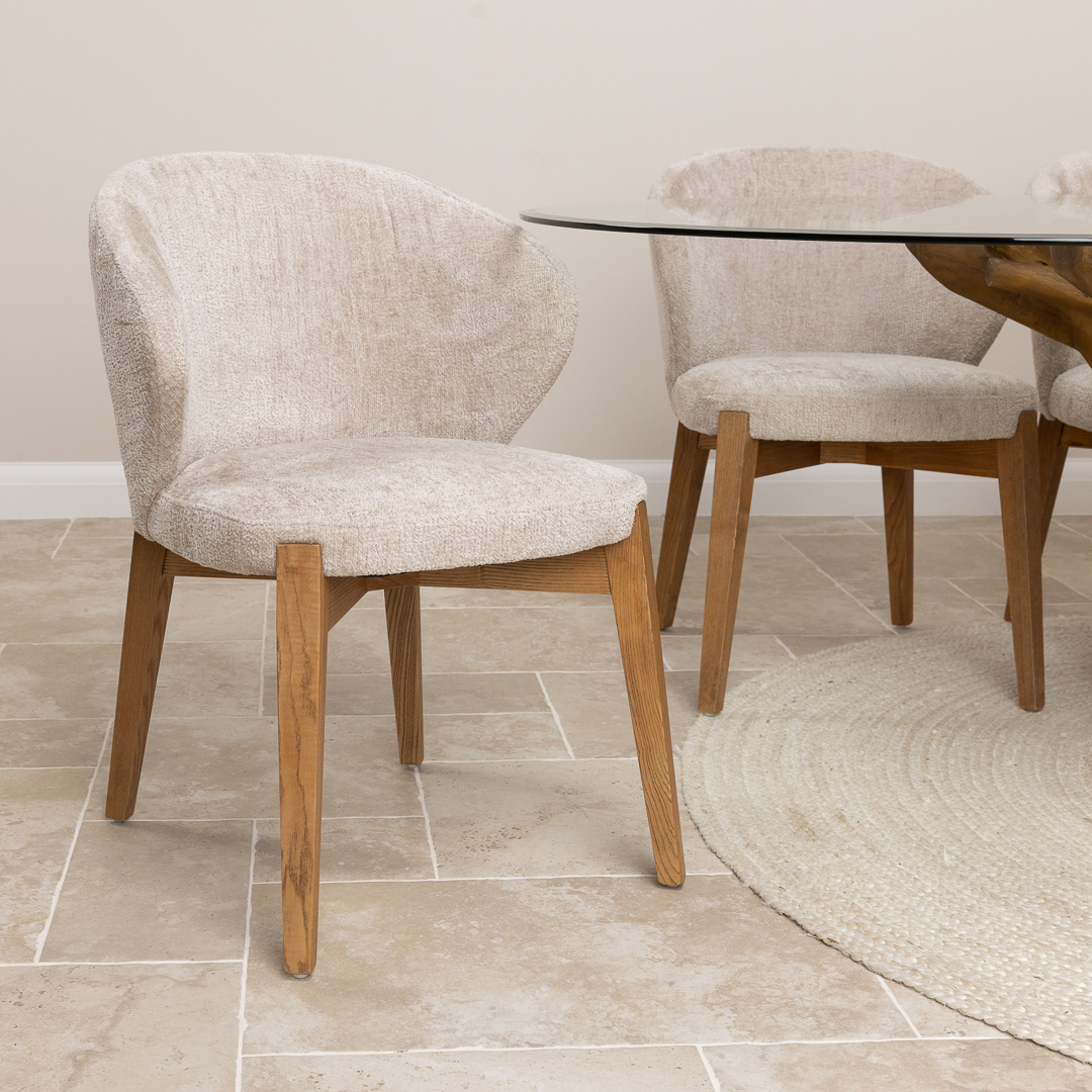 120cm Circular Teak Flute Root Dining Table with 4 Upholstered Cove ChairsIn stock