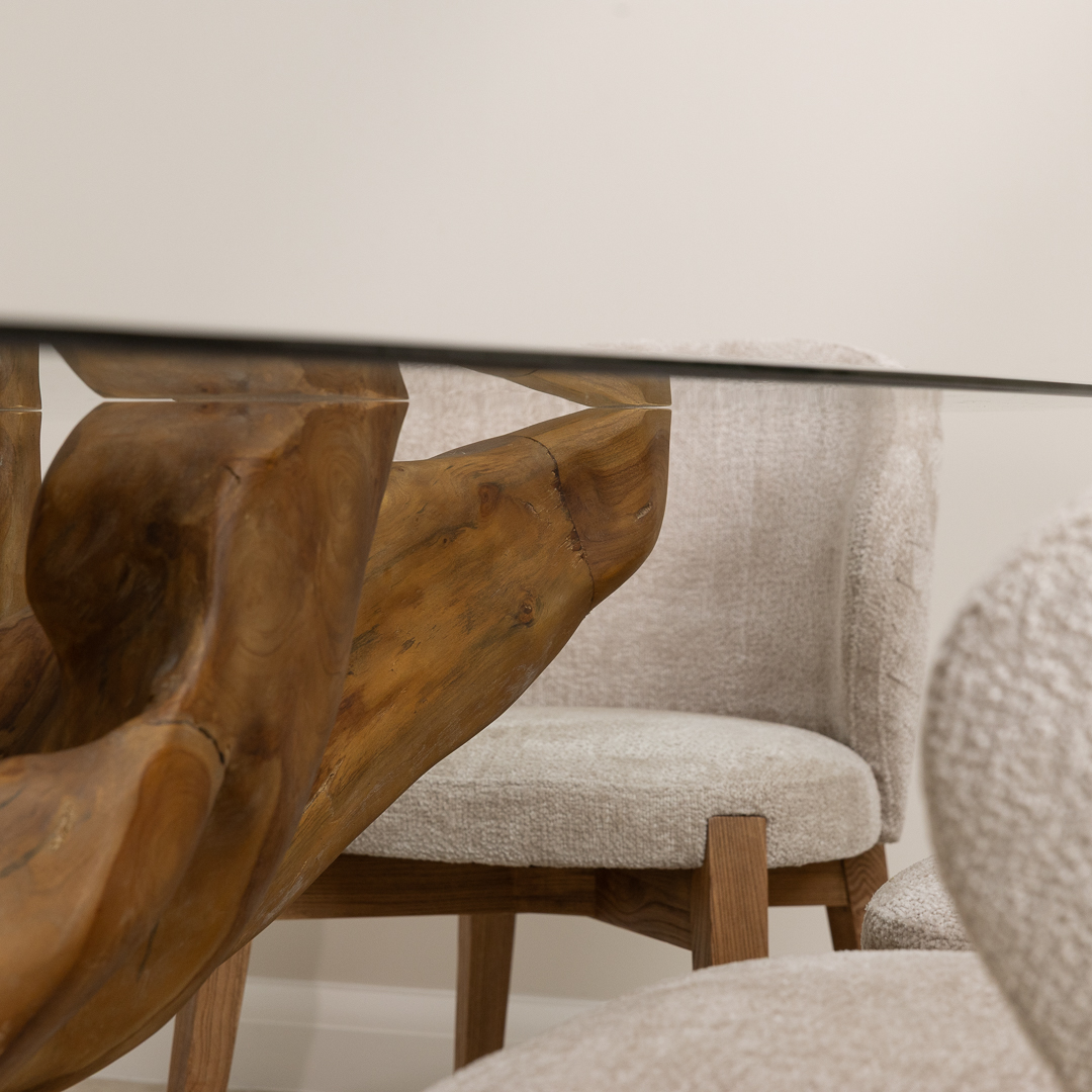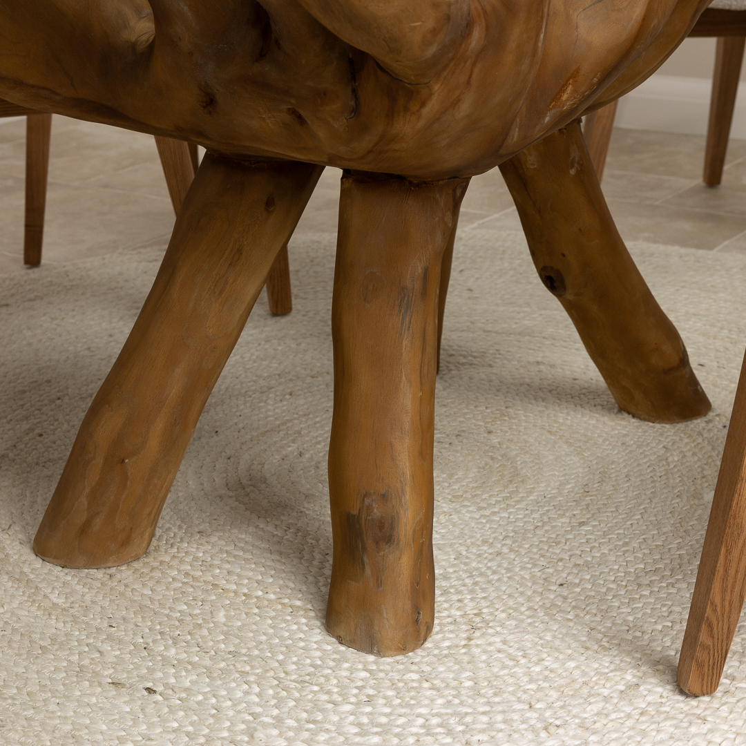 150cm Circular Teak Root Piece Dining Table with 6 Upholstered Cove ChairsIn stock