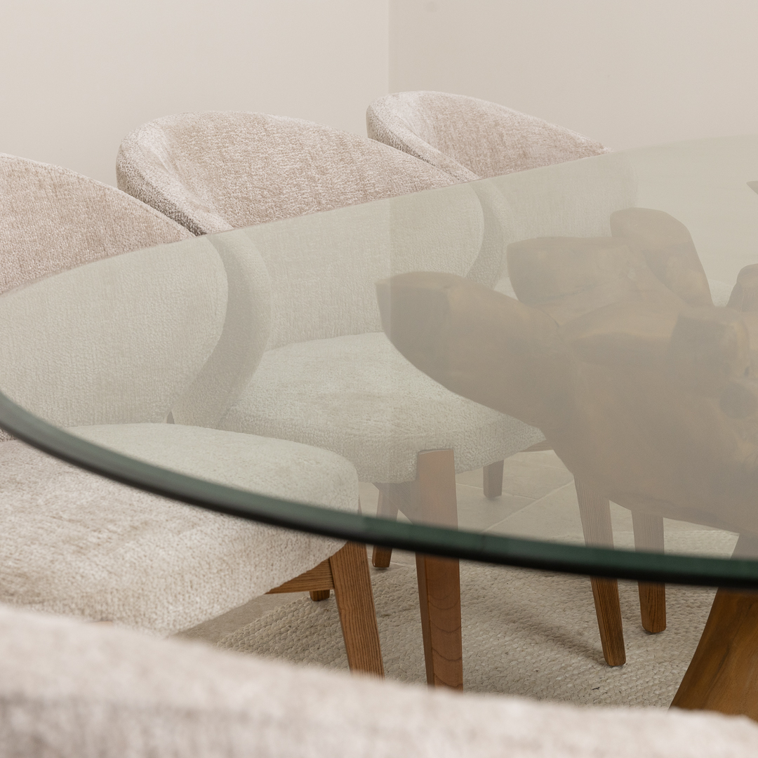 240cm x 120cm Oval Reclaimed Teak Root Indoor Dining Table with 10mm Toughened Safety GlassIn stock