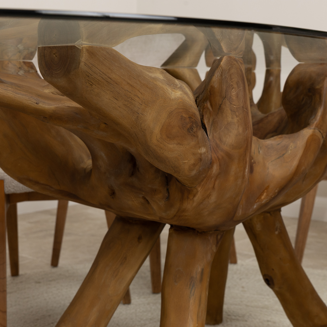 150cm Circular Reclaimed Teak Root Piece Dining Table with 10mm Toughened Safety GlassIn stock