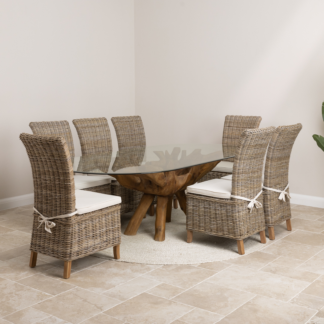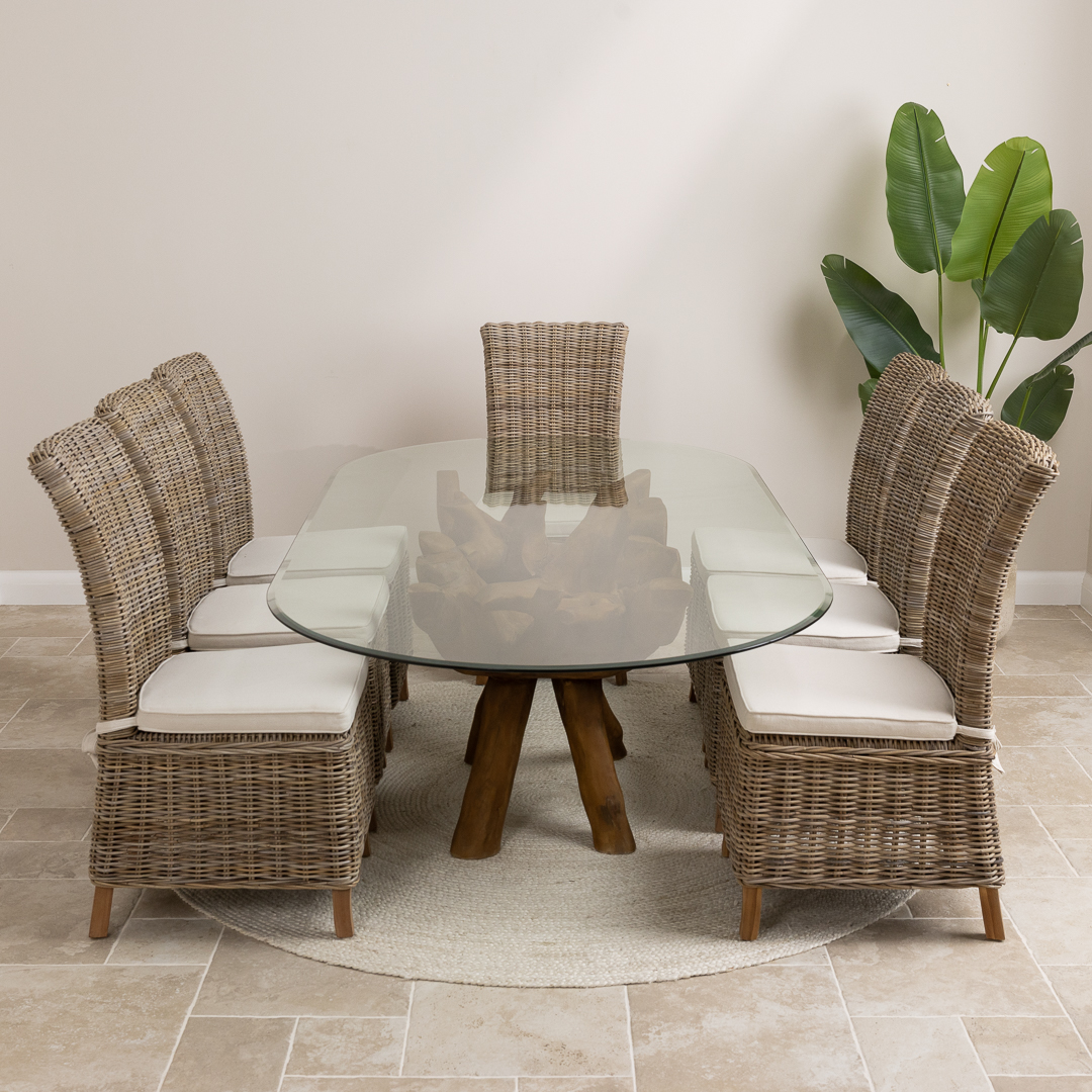 180cm x 120cm Oval Teak Root Dining Table with 6 Natural Kubu Wicker ChairsIn stock