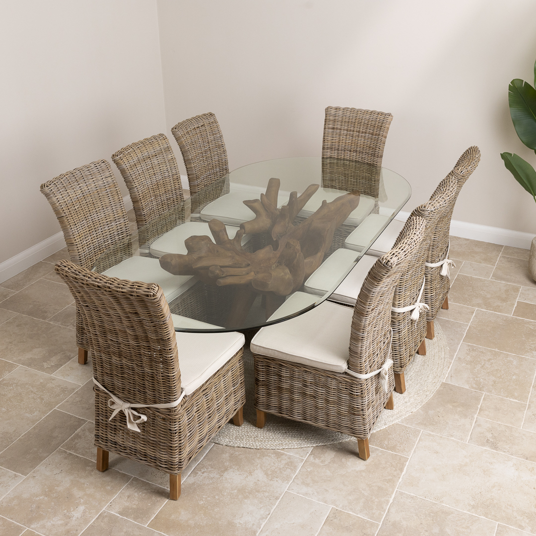 240cm Oval Teak Root Dining Table with 8 Natural Kubu Wicker Chairs