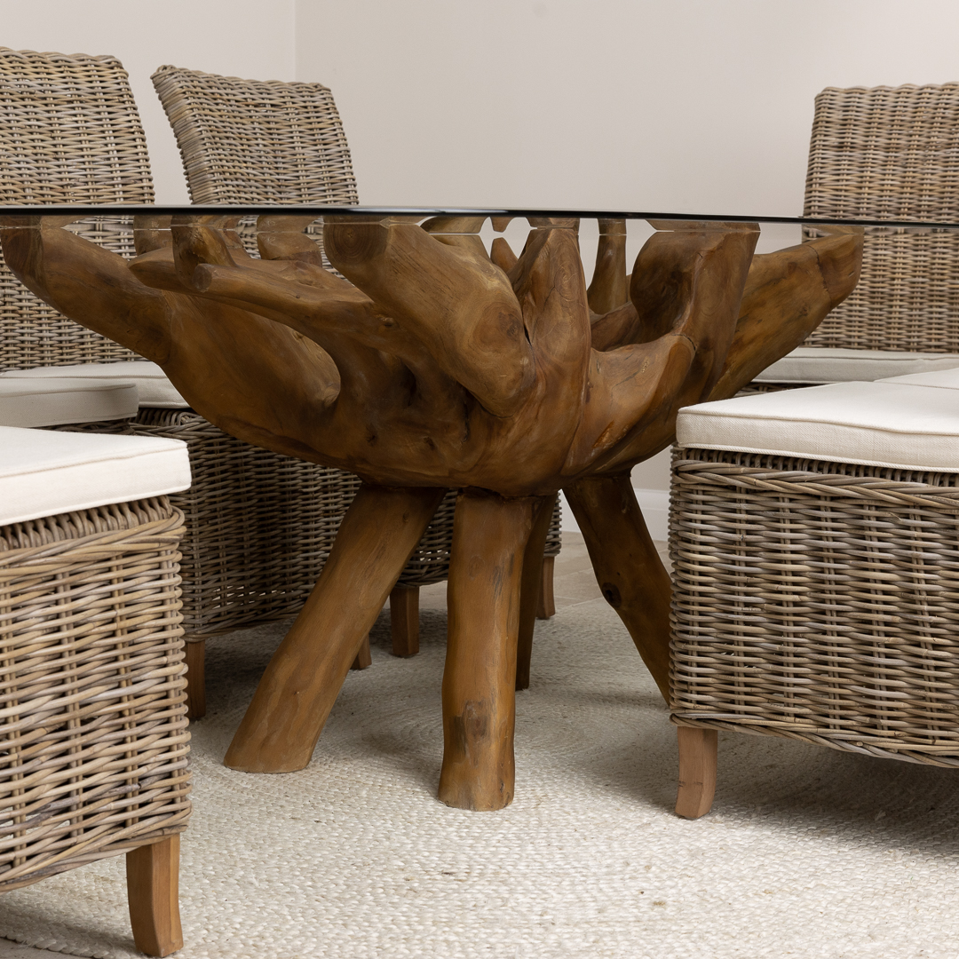 150cm Circular Teak Root Piece Dining Table with 6 Natural Kubu Wicker ChairsIn stock