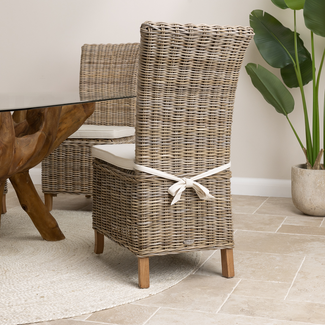 180cm x 120cm Rectangular Reclaimed Teak Root Indoor Dining Table with 4 or 6 Natural Kubu Wicker ChairsIn stock