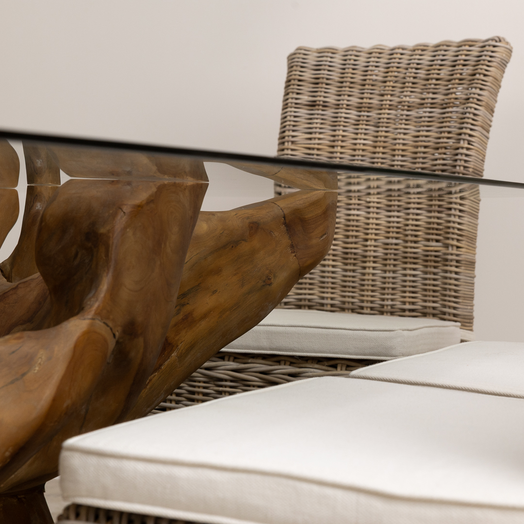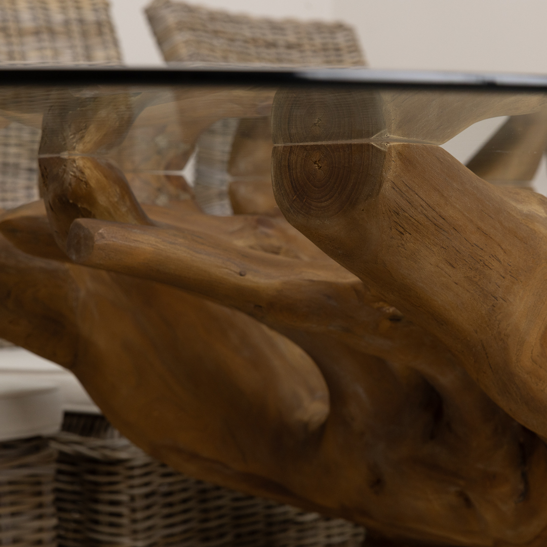 240cm x 120cm Rectangular Reclaimed Teak Root Indoor Dining Table with 10mm Toughened Safety GlassIn stock