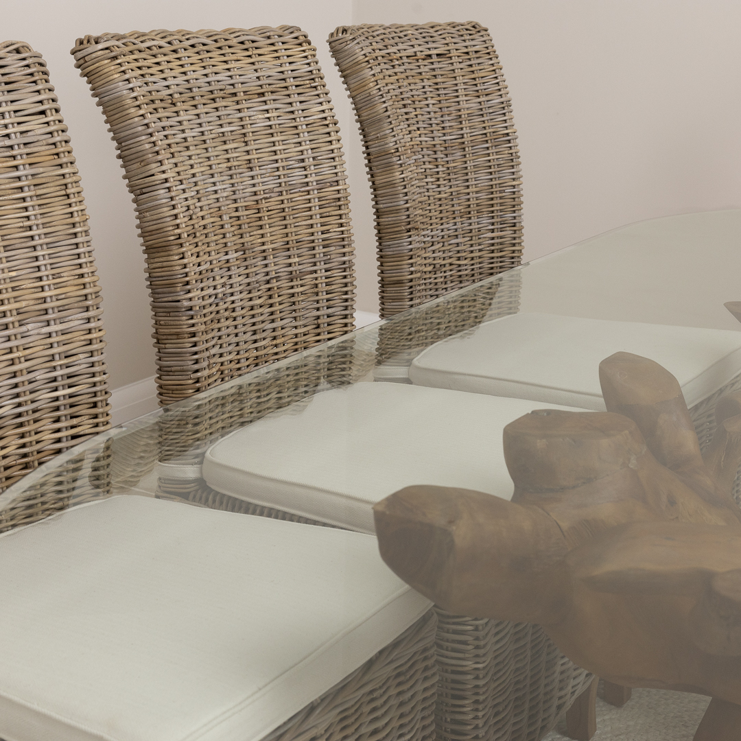 240cm Rectangular Reclaimed Teak Root Indoor Dining Table with 6 or 8 Natural Kubu Wicker ChairsIn stock