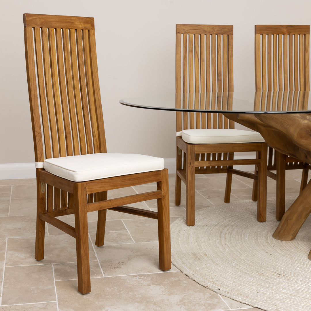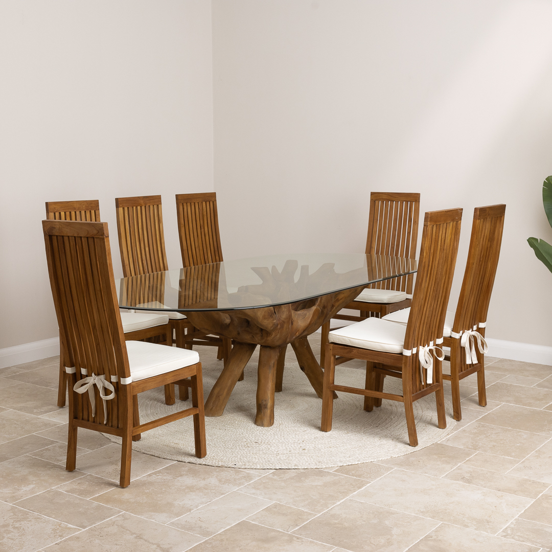 180cm x 120cm Rectangular Teak Root Dining Table with 4 or 6 Upholstered Cove ChairsIn stock