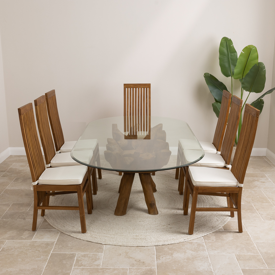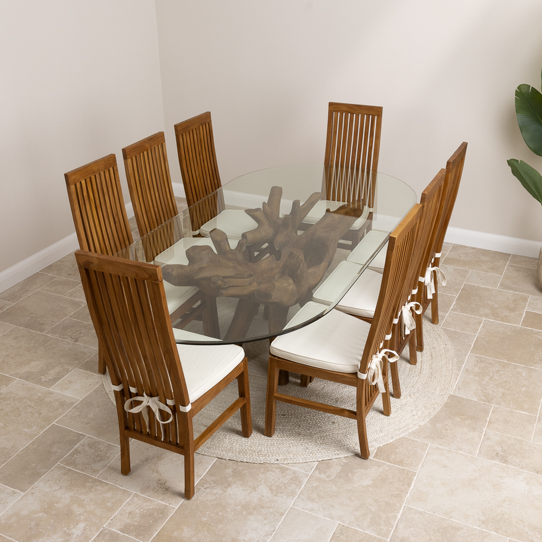 180cm x 120cm Oval Teak Root Dining Table with 6 Upholstered Cove ChairsIn stock