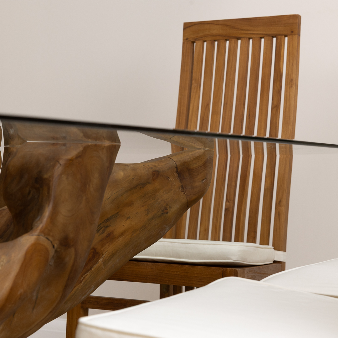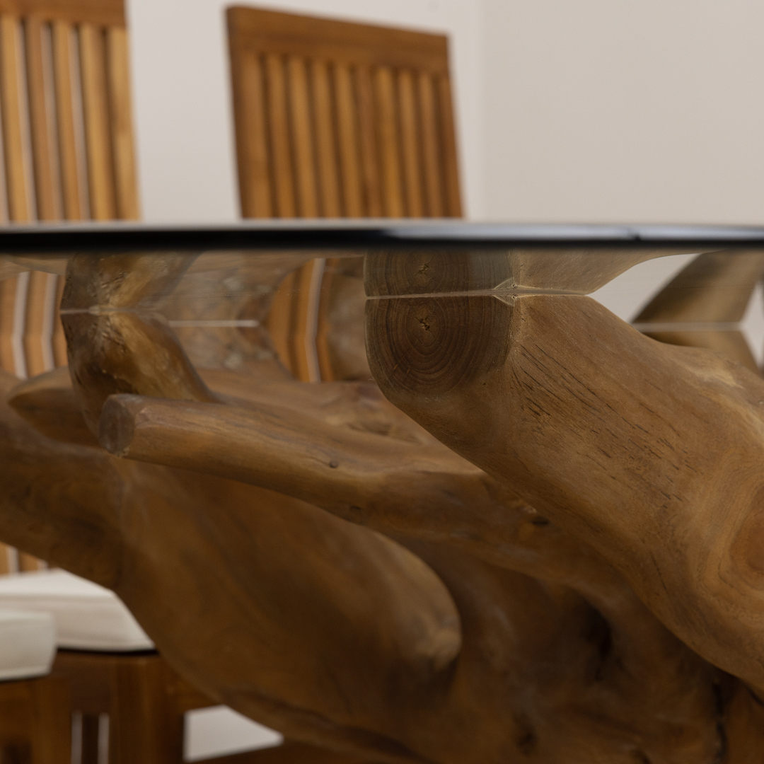 240cm x 120cm Rectangular Reclaimed Teak Root Indoor Dining Table with 10mm Toughened Safety GlassIn stock