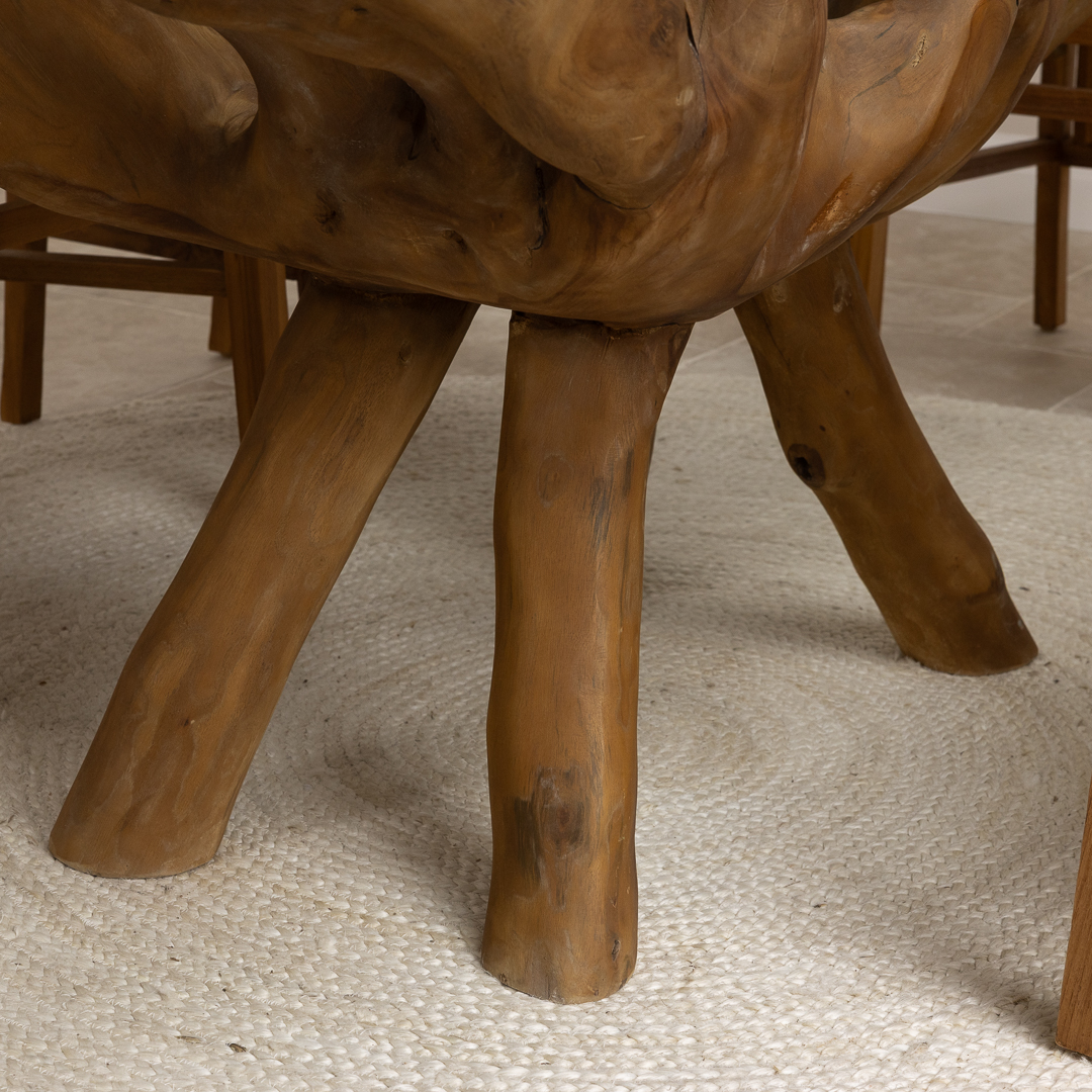 150cm Circular Reclaimed Teak Root Piece Dining Table with 10mm Toughened Safety GlassIn stock