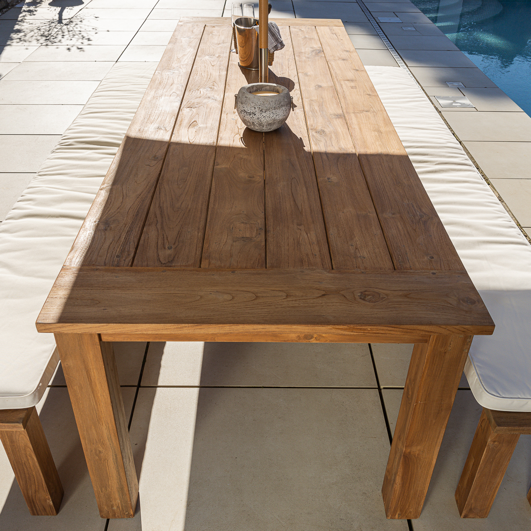 200cm Rectangular Natural Reclaimed Teak Straight Leg Outdoor Dining Table with 2 BenchesIn stock