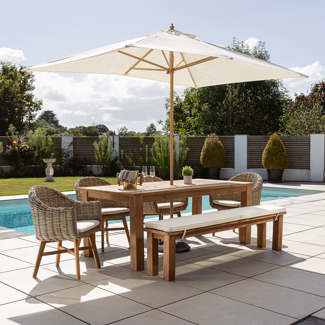 240cm Rectangular Natural Reclaimed Teak Straight Leg Outdoor Dining Table with Bench & 3 or 5 Natural Kubu Wicker ChairsIn stock