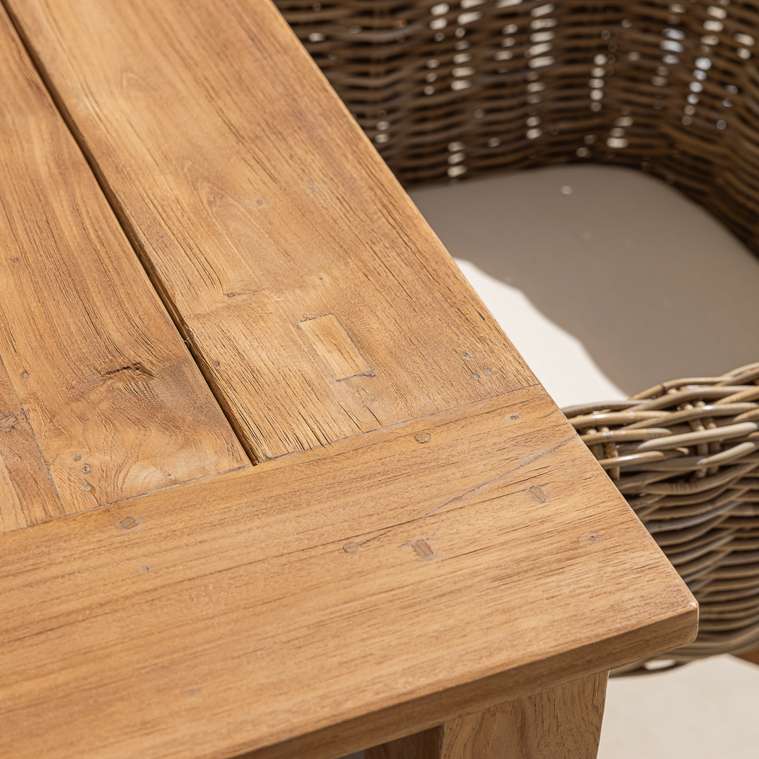200cm Rectangular Natural Reclaimed Teak Straight Leg Outdoor Dining Table with 4 or 6 Natural Kubu Wicker ChairsIn stock