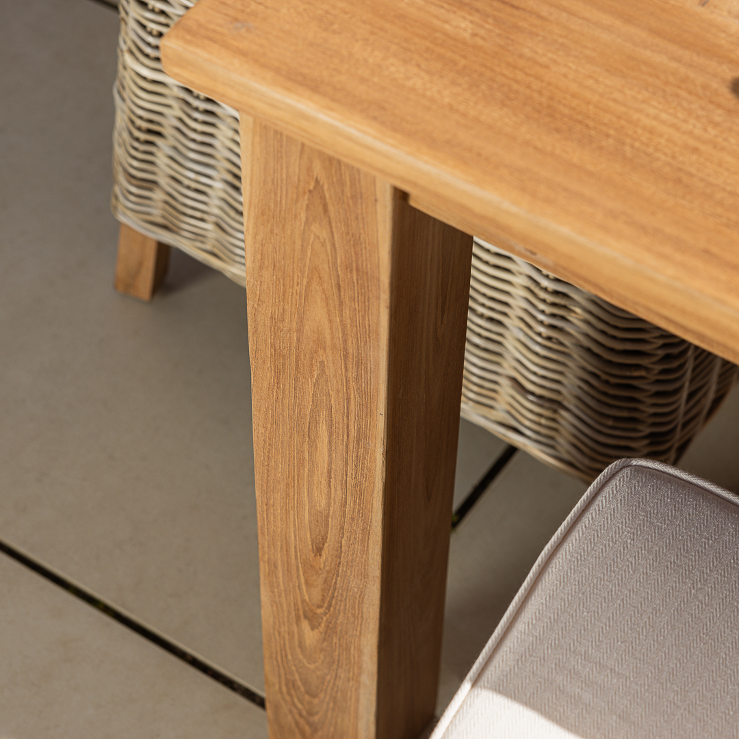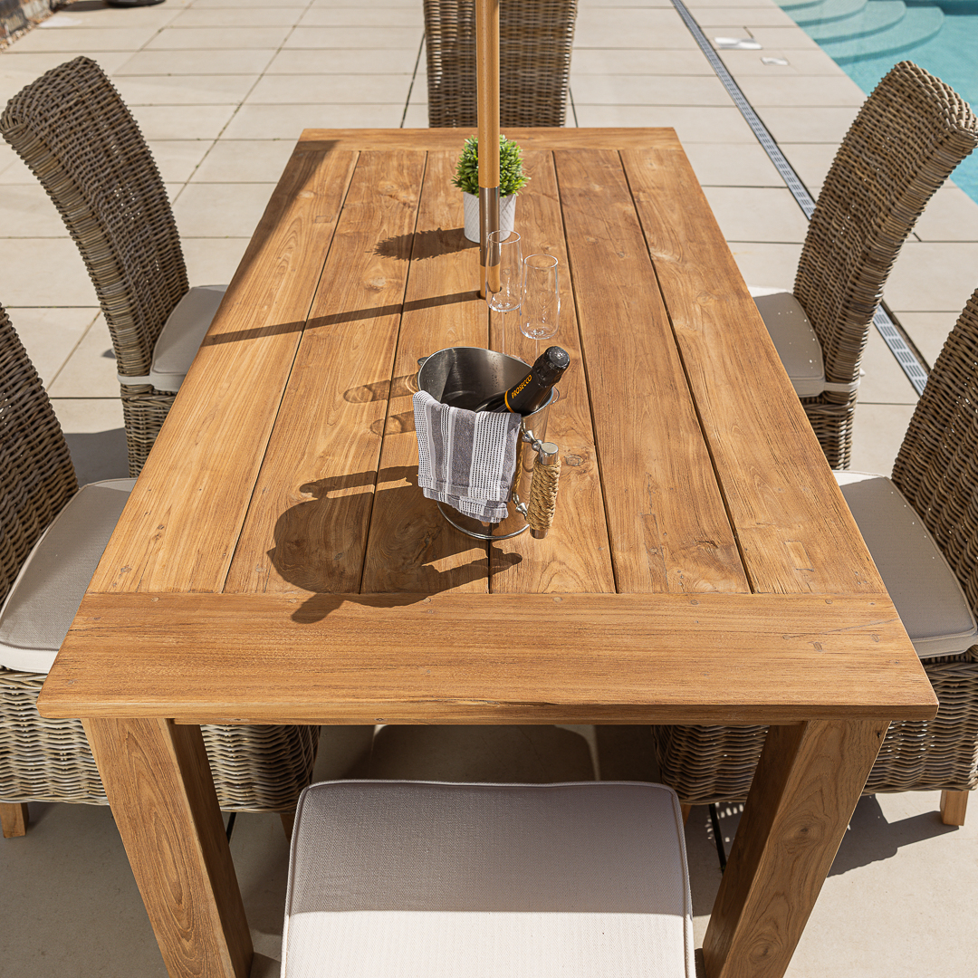 This Onyx Dining Set pairs a 200cm reclaimed teak table with Natural Kubu wicker chairs for a warm, textural outdoor look. Crafted from previously used teak, the table showcases rich grain and long‑lasting durability. The woven chairs add comfort and organic charm, creating an inviting space for relaxed garden dining.