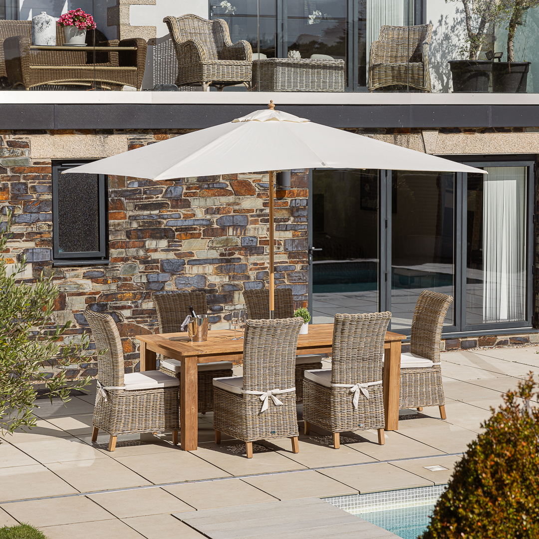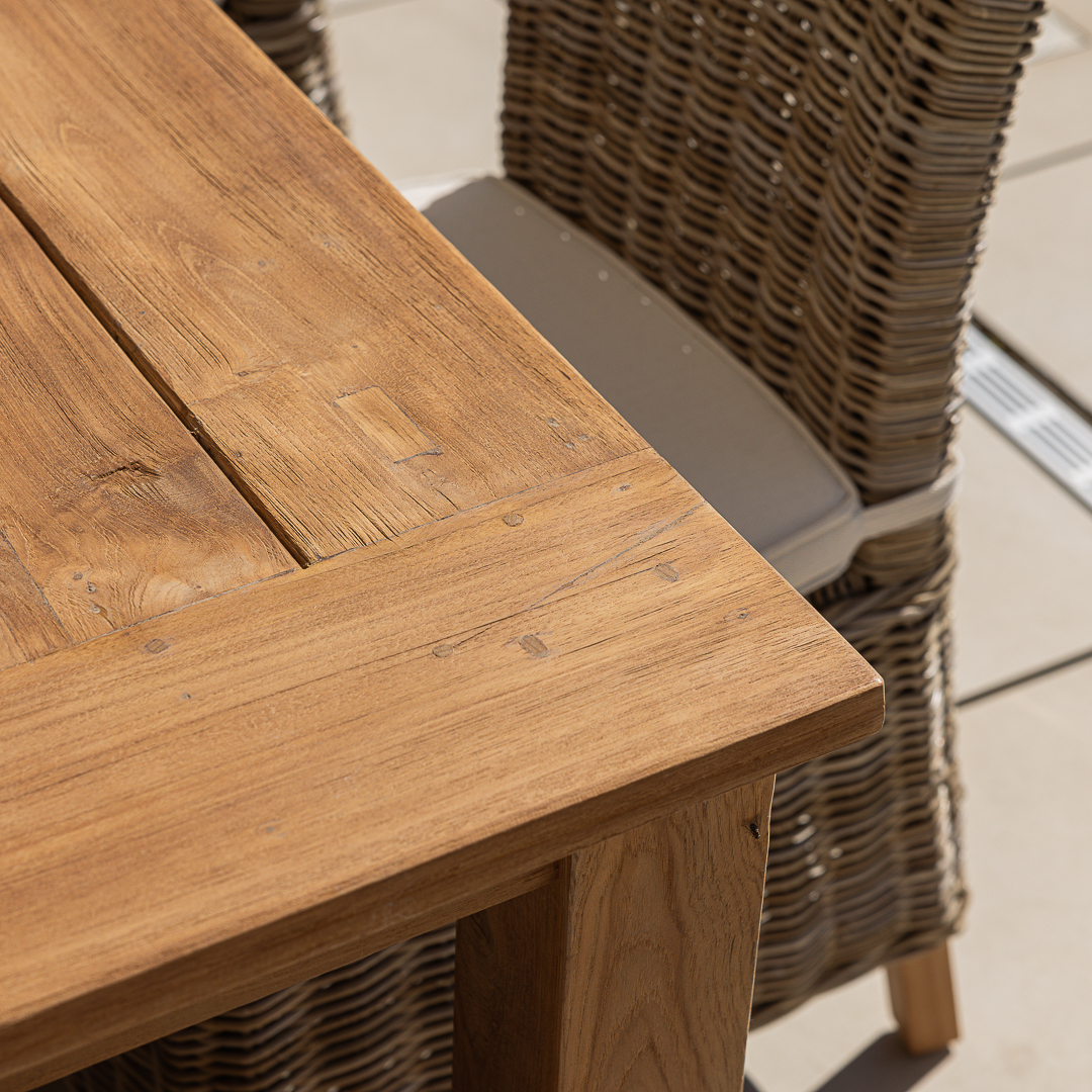 240cm Rectangular Natural Reclaimed Teak Straight Leg Outdoor Dining Table with 6 or 8 Natural Kubu Wicker ChairsIn stock