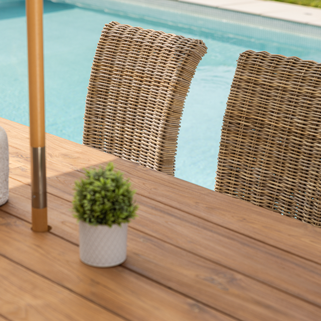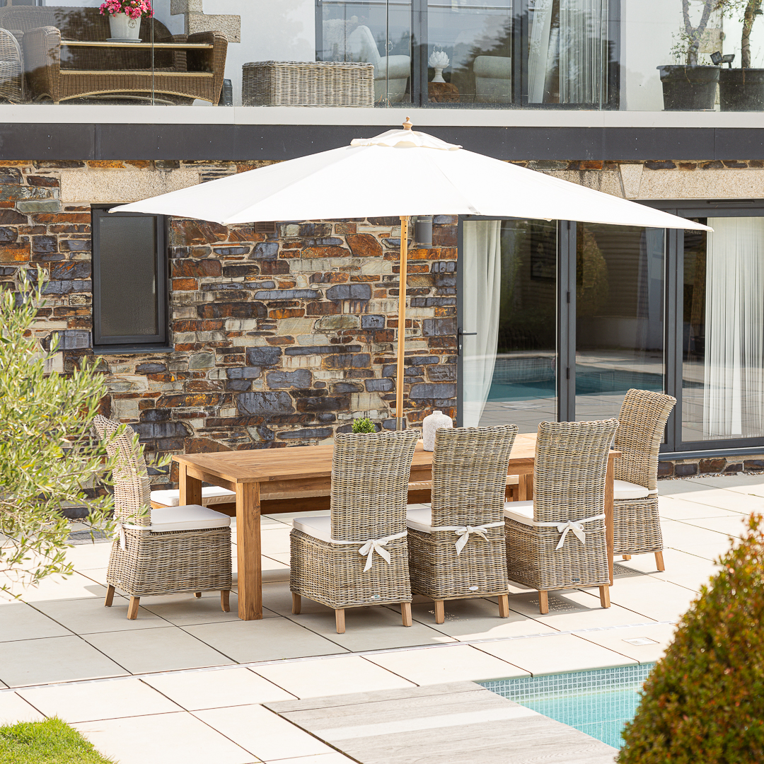 240cm Rectangular Natural Reclaimed Teak Straight Leg Outdoor Dining Table with 6 or 8 Natural Kubu Wicker ChairsIn stock
