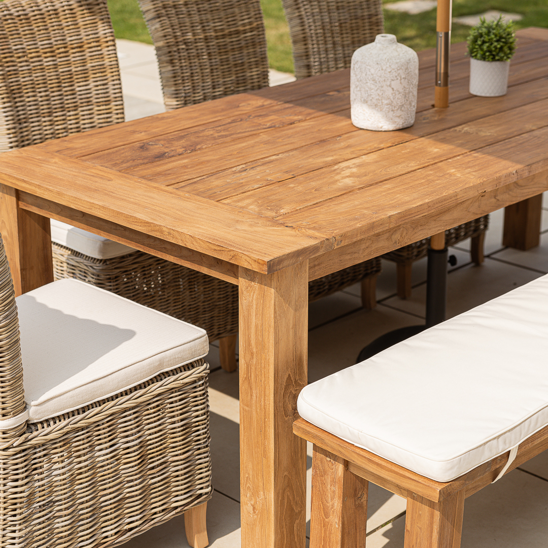 240cm Rectangular Natural Reclaimed Teak Straight Leg Outdoor Dining Table with Bench & 3 or 5 Natural Kubu Wicker Chairs