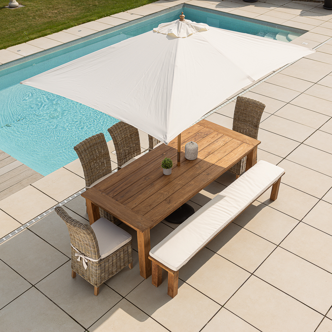 300cm Rectangular Natural Reclaimed Teak Straight Leg Outdoor Dining Table with Bench & 4 or 6 Natural Kubu Wicker ChairsIn stock