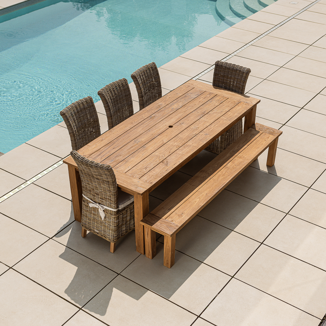 200cm Rectangular Natural Reclaimed Teak Straight Leg Outdoor Dining Table with Bench & 2 or 4 Natural Kubu Wicker ChairsIn stock