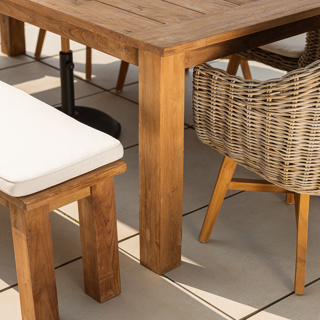 200cm Rectangular Natural Reclaimed Teak Straight Leg Outdoor Dining Table with Bench & 2 or 4 Scandi ArmchairsIn stock