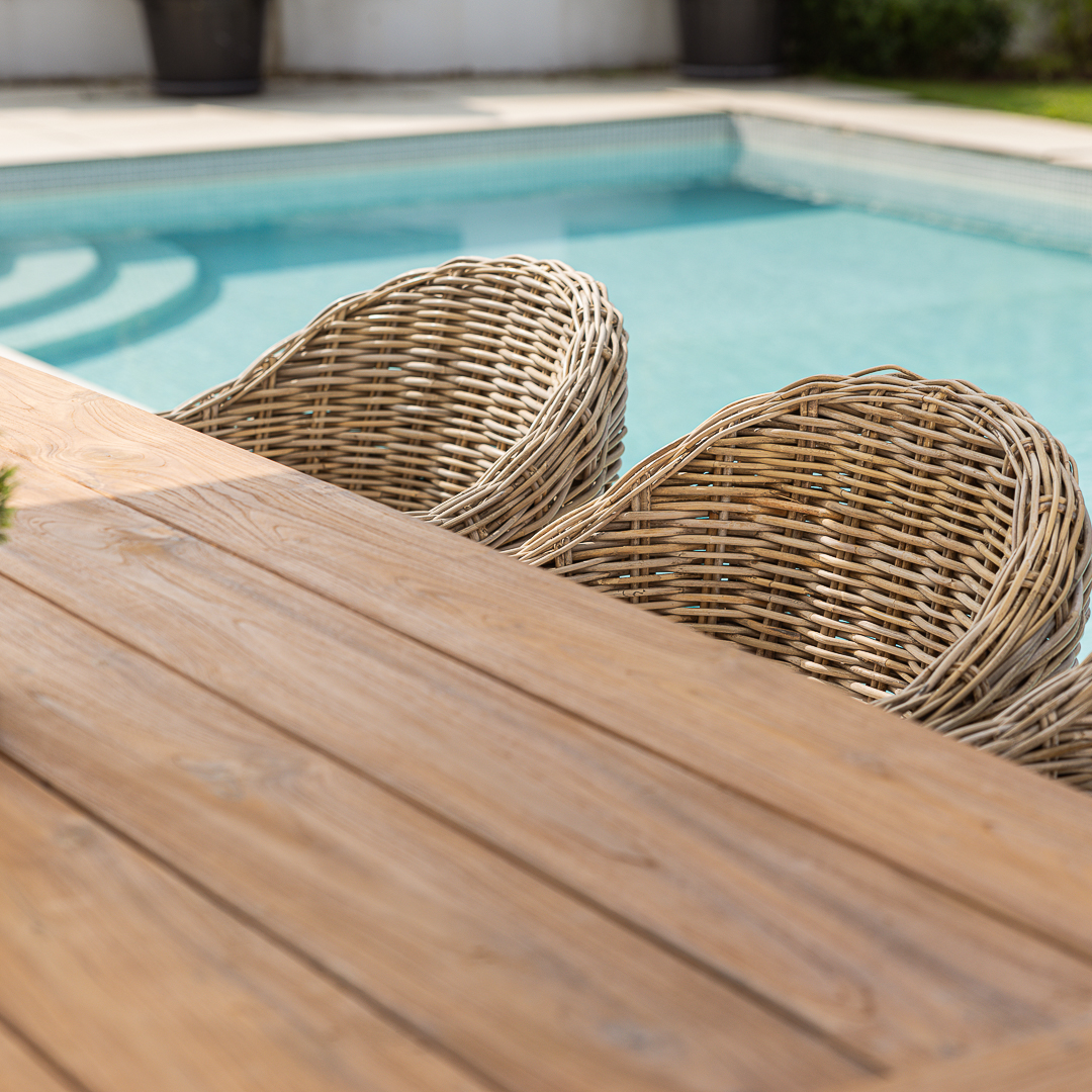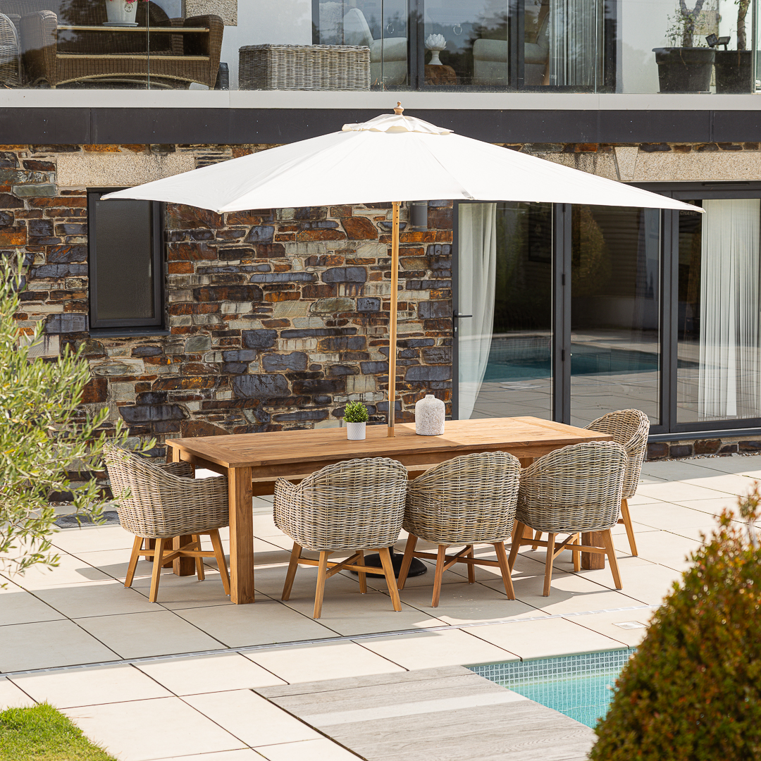 240cm Rectangular Natural Reclaimed Teak Straight Leg Outdoor Dining Table with 6 or 8 Natural Kubu Wicker ChairsIn stock