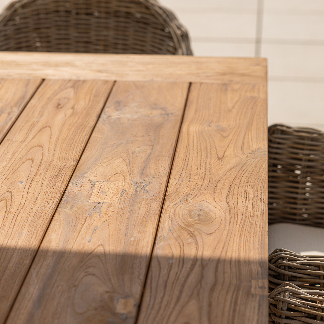 200cm Rectangular Natural Reclaimed Teak Straight Leg Outdoor Dining Table with 4 or 6 Natural Kubu Wicker ChairsIn stock