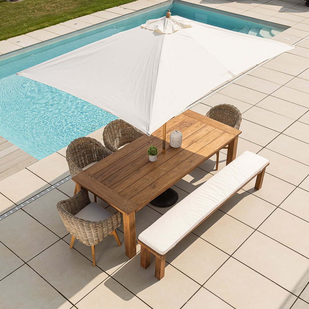 200cm Rectangular Natural Reclaimed Teak Straight Leg Outdoor Dining Table with Bench & 2 or 4 Natural Kubu Wicker ChairsIn stock