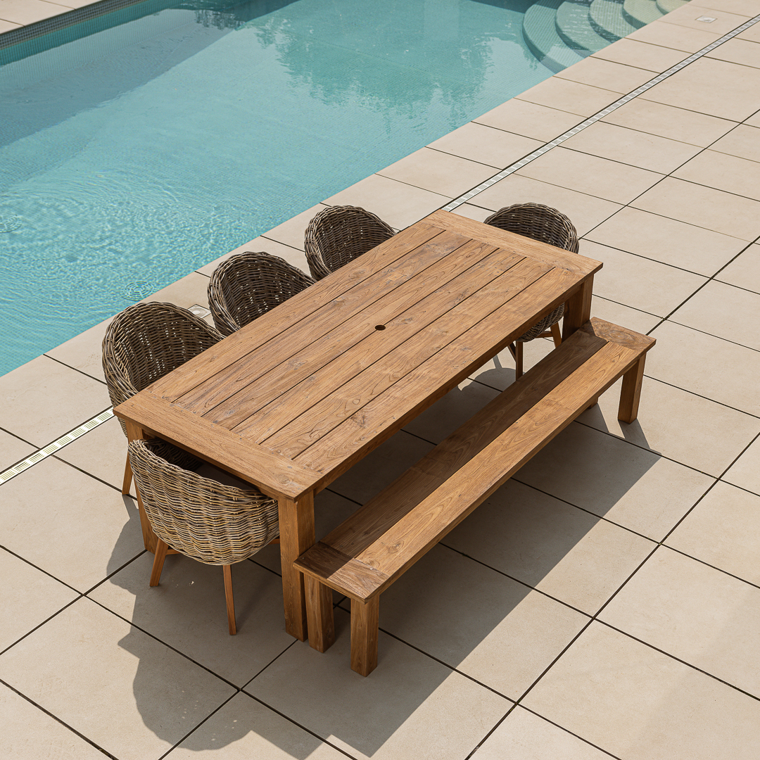 240cm Rectangular Natural Reclaimed Teak Straight Leg Outdoor Dining Table with Bench & 3 or 5 Natural Kubu Wicker ChairsIn stock