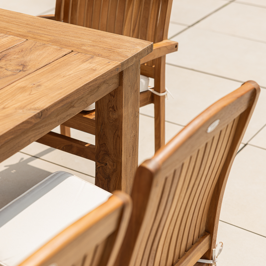 200cm Rectangular Natural Reclaimed Teak Straight Leg Outdoor Dining Table with 4 or 6 Marley Teak Stacking ChairsIn stock