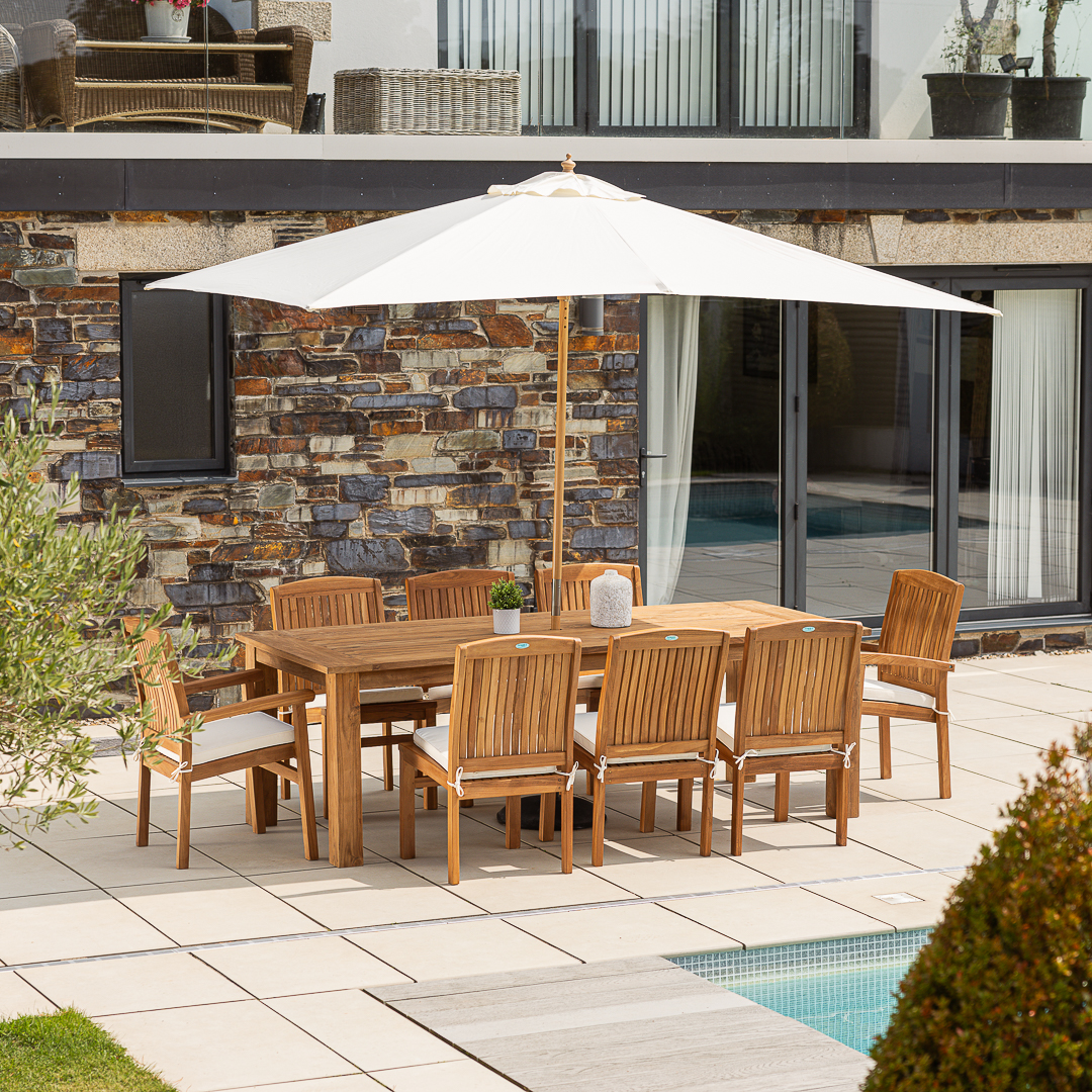 300cm Rectangular Natural Reclaimed Teak Straight Leg Outdoor Dining Table with 8 or 10 Scandi ArmchairsIn stock