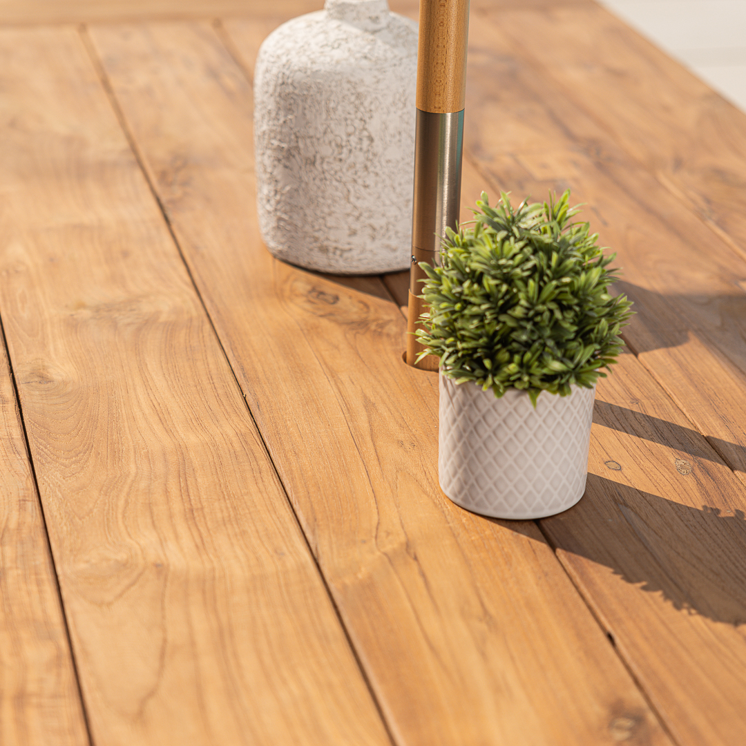 200cm Rectangular Natural Reclaimed Teak Straight Leg Outdoor Dining Table with 4 or 6 Marley Teak Stacking ChairsIn stock