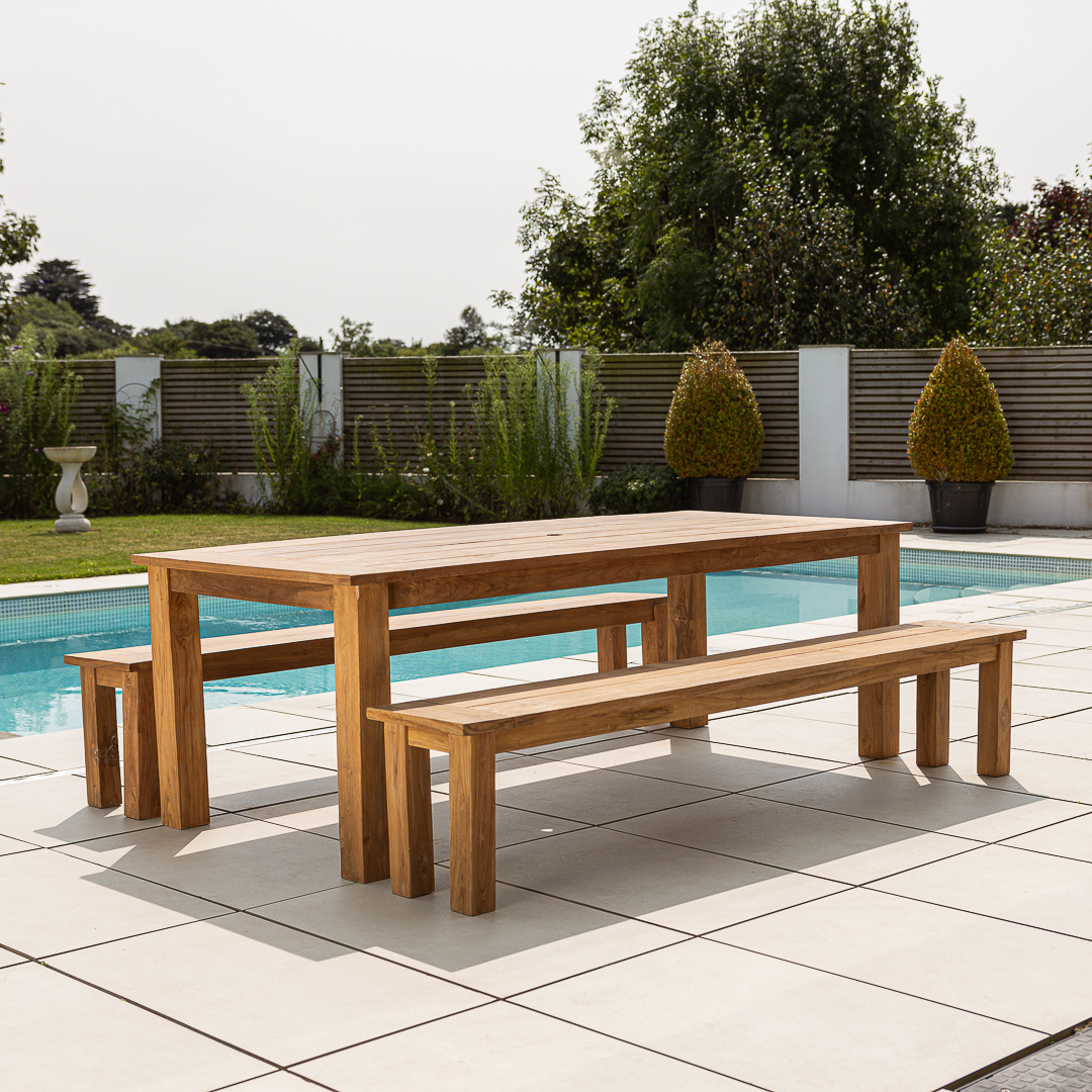300cm Rectangular Natural Reclaimed Teak Straight Leg Outdoor Dining Table with Bench & 4 or 6 Marley Teak Stacking ChairsIn stock