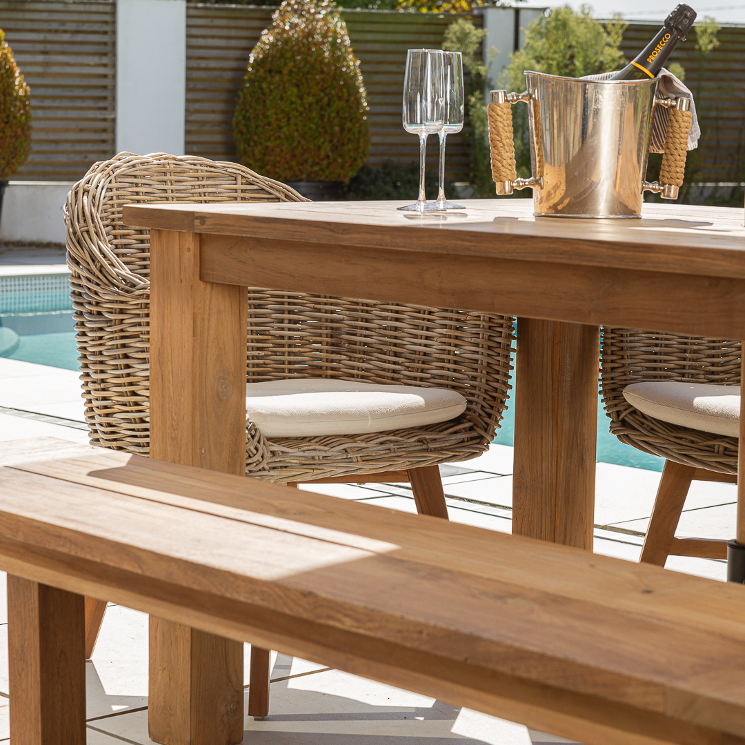 240cm Rectangular Natural Reclaimed Teak Straight Leg Outdoor Dining Table with Bench & 3 or 5 Natural Kubu Wicker ChairsIn stock